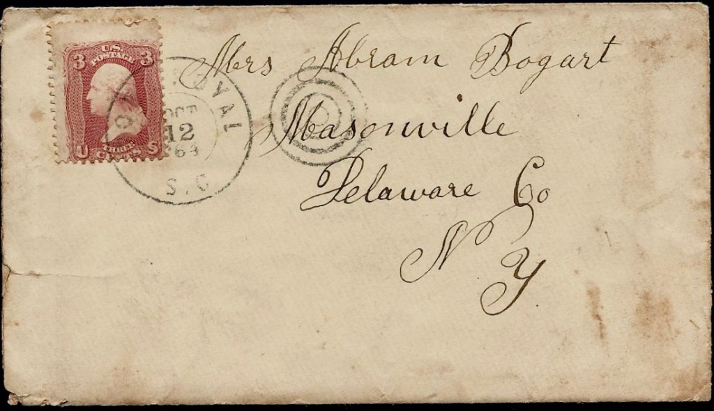 The following letters were written by 40 year-old Abram Bogart (1825-1899) of Masonville, Delaware county, New York. Abram enlisted on 15 August 1862, at Sidney, Delaware County, for a period of three years and was mustered into the 144th New York Infantry Regiment, Co. I, on 27 September 1862. At the time of his enlistment he was 37 years old and was described as being a light-haired, blued-eyed farmer who stood 5 feet 4 inches tall. He was transferred to Co. K, on 15 October 1862. He mustered out with his company on June 25, 1865, at Hilton Head, S.C. After the war he returned home where he worked as a farmer with his wife Mary, and their three children.