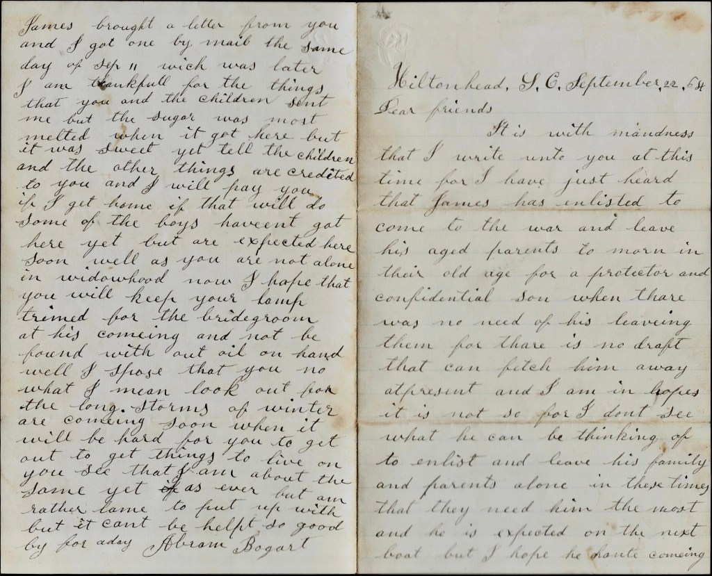 It is with madness that I write unto you at this time for I have just heard that James has enlisted to come to the war and leave his aged parents to mourn in their old age for a protector and confidential son when there was no need of his leaving them for there is no draft that can fetch him away at present. I don’t see what he can be thinking of to enlist and leave his family and parents alone in these times that they need him the most and he is expected on the next boat, but I hope he ain’t coming.