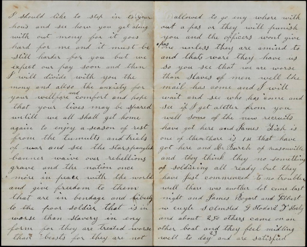 I should like to step in your house and see how you get along without money for it goes hard for me and it must be still harder for you. But we expect our pay soon and then I will divide with you the money and also the anxiety for your welfare and comfort and hope that your lives may be spared until we all shall get home again to enjoy a season of rest from the tumults and trials of war, and see the Star Spangled Banner wave over rebellious graves and the Nation once more in peace with the world, and give freedom to them that are in bondage and liberty to the poor soldier that is worse than slavery in any form for they are treated worse than beasts, for they are not allowed to go anywhere without a pass or they will punish you, and the officers won’t give a pass unless they are a mind to and that’s where they have us. So you see that we are worse than slaves.