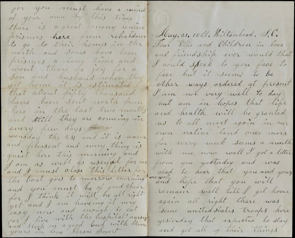 Wednesday the 24, and it is warm and pleasant and everything is quiet here this morning and I am as well as usual for me and I must close this letter for the boat goes tomorrow morning and you must be of good cheer for I think it will be all right yet and I am having it very easy now and enough to eat for I live with the hospital nurses and sleep on a good bed with them. Yours in love, — Abram Bogart
