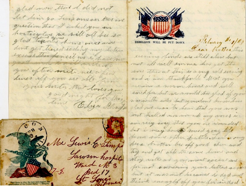 It is a pleasure to me this evening that I have the pleasure to write you a few lines to let you know that we have our health and more and hope that this may find you and Worthy well and hearty. Since I saw you we have all been sick. Benjamin was taken sick soon after you went away. He was taken with a severe pain in the lungs and spit blood for forty-eight hours [ ] and then it went into the typhoid fever and then he lay dangerously bad for eighteen days. The doctor blister[ed] him severely on the stomach and back which is all that saved him from the other world.