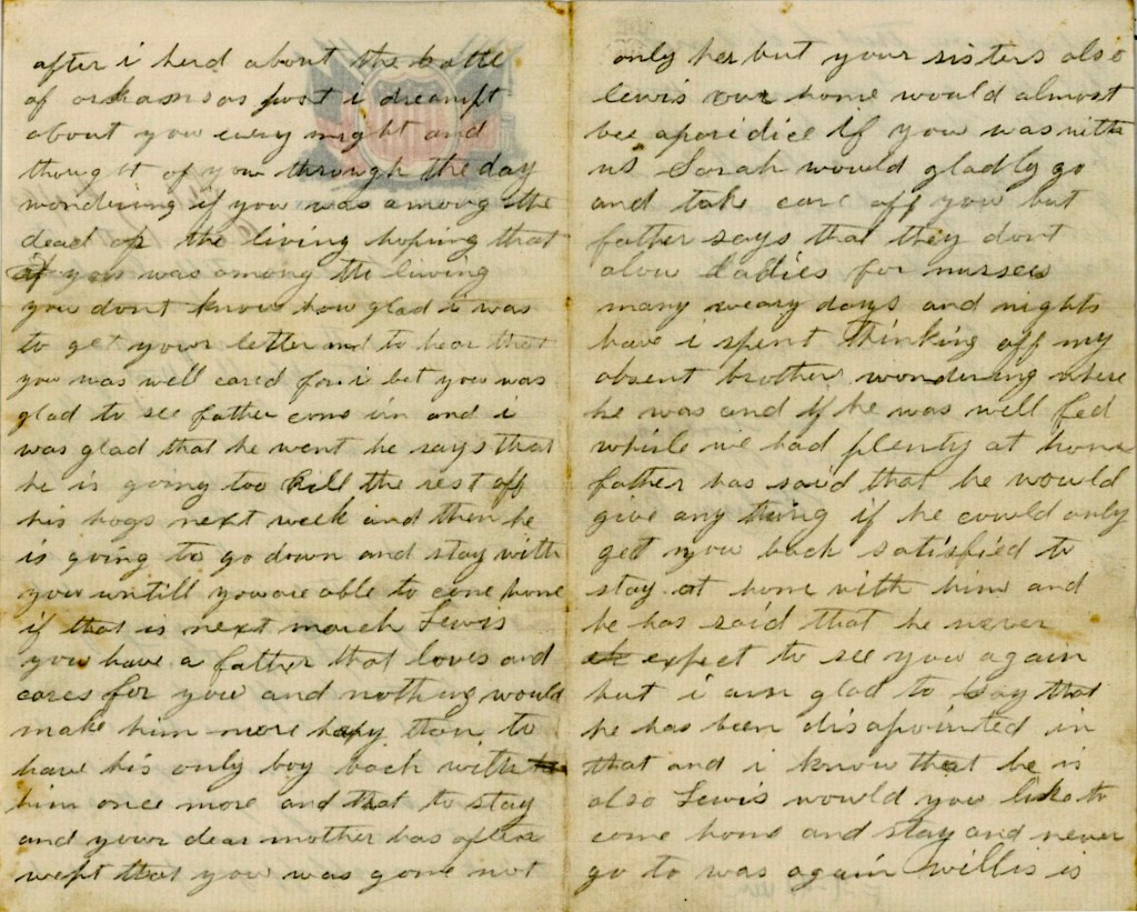 Lucinda has had the pleasure of seeing Peter’s face once more. Peter got a furlough for fifteen days and came home and stayed his time and then started back to his regiment on Sunday last [at] half past three o’clock. Richard took him to Jacksonville. He said that the Boys is well. Sister, you might know how it would be with Lucinda. It was joy to meet and sorrow to part with her. She did not take it as hard as I expected she would.