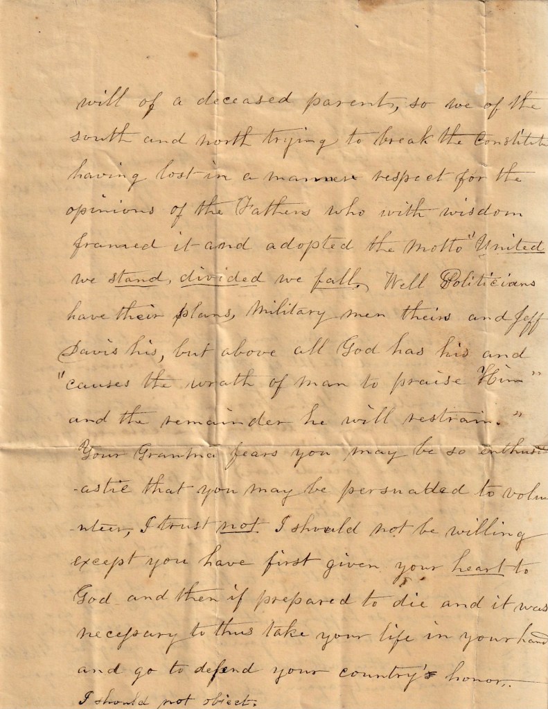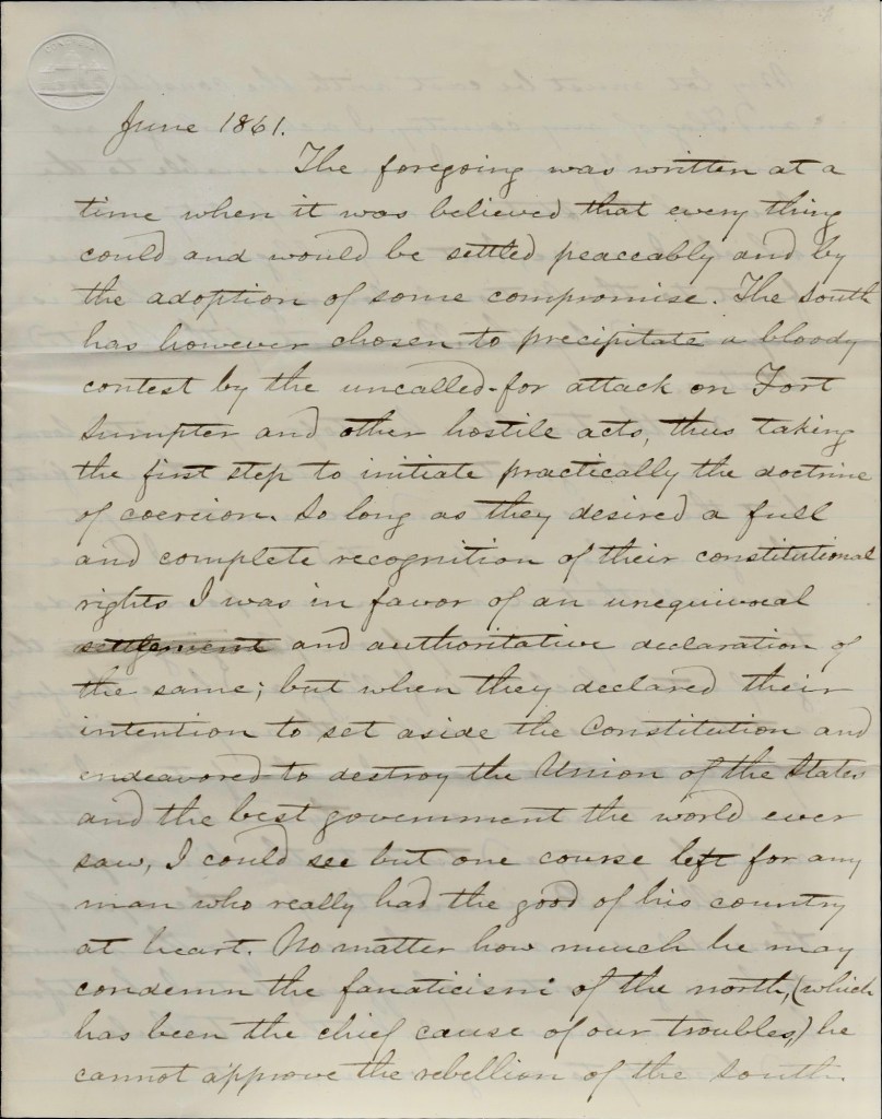 The foregoing was written at a time when it was believed that everything could and would be settled peaceably and by the adoption of some compromise. The South as, however, chosen to precipitate a bloody contest by the uncalled for attack on Fort Sumter and other hostile acts, thus taking the first step to initiate practically the doctrine of coercion. So long as they desired a full and complete recognition of their constitutional rights, I was in favor of an unequivocal settlement and authoritative declaration of the same; but when they declared their intention to set aside the Constitution and endeavored to destroy the Union of the States and the best government the world ever saw, I could see but one course left for any man who really had the good of his county at heart. No matter how much he may condemn the fanaticism of the north (which has been the chief cause of our troubles), he cannot approve the rebellion of the South.