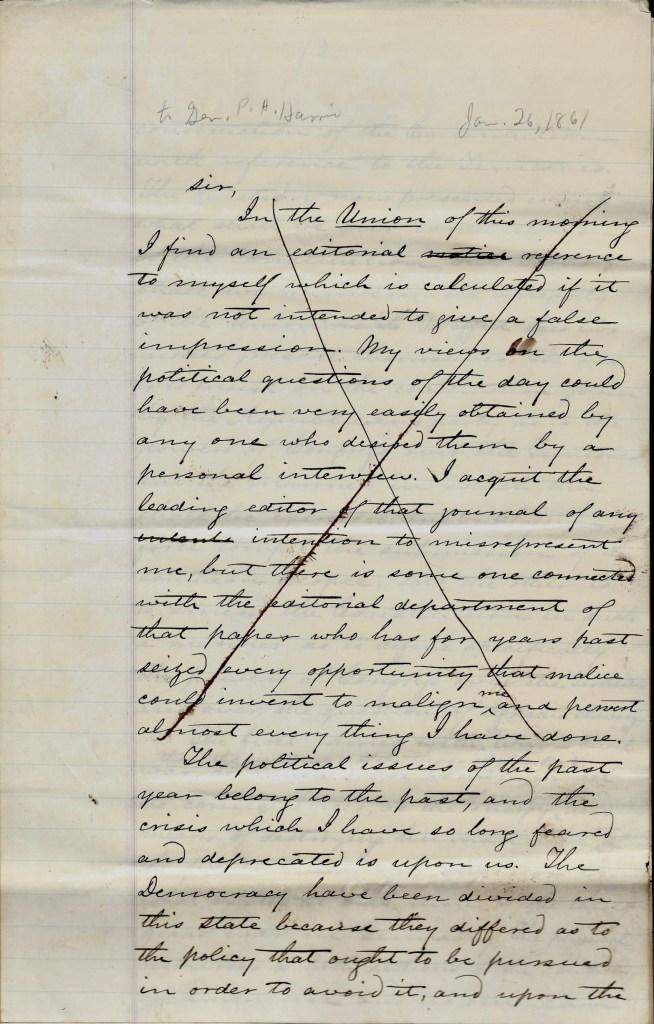 In the following two documents, Denver expresses his views on the deepening divide between the North & South from his residence in California in January 1861, some three months before hostilities erupted. The second document, written in June 1861, is his retrospective reaction to the dashed hopes expressed in his first document and includes the rationale for pursuing his personal course of action as a Union Democrat. The first document was clearly a draft and includes handwritten corrections by Denver. The finished letter was known to have been submitted to Harris because there is a reference to it in George C. Barns’ book, Denver, the Man, published in 1949.
