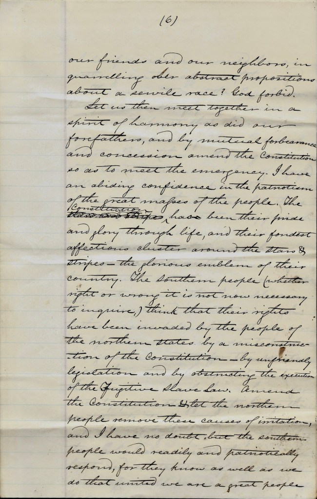 Let us then meet together in a spirit of harmony as did our forefathers, and by mutual forbearance and concession amend the Constitution so as to meet the emergency. I have an abiding confidence in the patriotism of the great masses of the people. The Constitution has been their pride and glory through life, and their fondest affections cluster around the stars & stripes—the glorious emblem of their country. The southern people (whether right or wrong it is not now necessary to inquire), think that their rights have been invaded by the people of the northern states by a misconstruction of the Constitution—by unfriendly legislation and by obstructing the execution of the Fugitive Slave Law. Amend the Constitution & let the northern people remove these causes of irritation, and I have no doubt but the southern people would readily and patriotically respond, for they know as well as we do that united we are a great people, while if divided we would be as nothing in the affairs of the world.