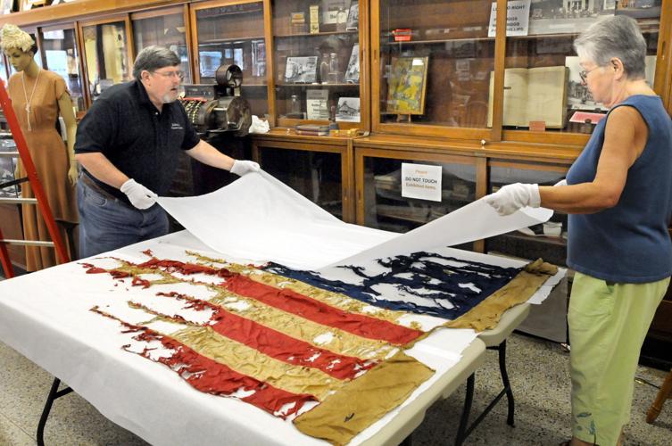 Tom Frew and Rose Gates reveal the remains of the flag that was given to Sullivan county’s Home Guard by Gov. Oliver P. Morton. “Sullivan County contained many Southern sympathizers and there was a strong presence of what was called the Knights of the Golden Circle, a pro-Southern secret society that was the forerunner of the Ku Klux Klan,” said Frew, president of the Sullivan County Historical Society Inc. “They shot down the flag and tore it to pieces. The main thing they sought to get rid of is the field of stars, which was the symbol of the union. They wanted a separate country of the confederate states,” Frew said. “To me, it is an example that you can’t destroy the United States. You can’t destroy the flag; it will hang on, just like this one,” Frew said. See Enduring Symbol: Torn, tattered Civil War-era flag.
