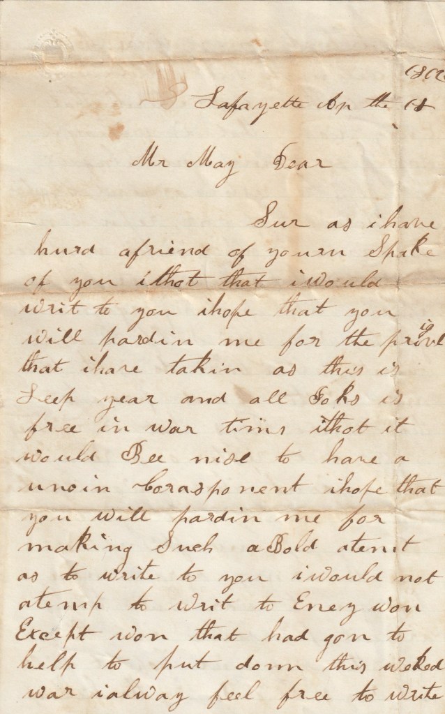 In this charming letter, Julia A. Donaldson of Lafayette, Indiana, wrote to a soldier identified only as “Mr. May” who may have been local boy or not. I have not been able to find Julia in census or directory records but she may have only living in Lafayette temporarily—perhaps as a housemaid or staying with a relative. It seems clear she and Mr. May did not know each other. She states she has a brother in the Union Army. The only Donaldson I can find in military records connected with Lafayette, Indiana is a Madison Donaldson of the 20th Indiana Infantry, which was formed in Lafayette but he does not appear in the census records there. As for Mr. May, there were four different soldiers with the surname May in the 20th Indiana Infantry. Perhaps he was one of these soldiers.