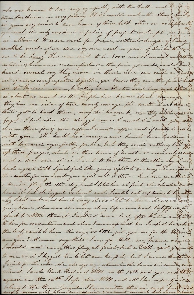 I received your most anxiously looked for letter today. Oh how thankful I am you are not here. Never in my life put together did I ever suffer such exquisite torture as I have since the news from Fort Sumter came; for I am living among a set of hungry wolves—I can call them nothing better, who are actually thirsting for the blood of those who are dearer to me than all the world beside, and they all take the greatest delight in letting me know the state of their feelings and insulting me in every possible way. I have prayed most earnestly that Christian forbearance and fortitude might be given me to endure in silence, and feel it was my my Heavenly Father who. was trying me for my good, and so far He has mercifully vouchsafed to hear me and I have with His gracious help been enabled to bear them. But I feel as if it will kill me to have to live so much longer—flesh and bloodcan’t bear it.