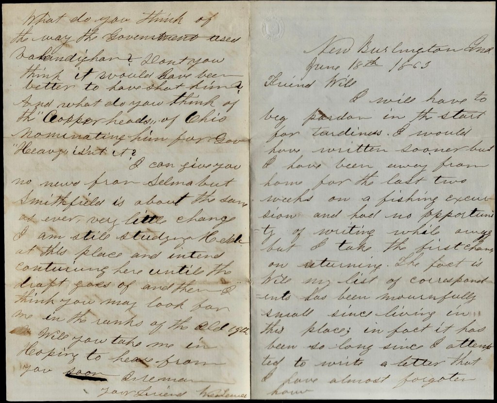 The author of this letter has not been identified. His signature appears to read, “Wes Land” but I can find no one by that name, or similar name, in New Burlington, Indiana. Regardless of his identity, Wes provides his friend in the Iron Brigade some interesting news about the attempt to set up the draft in Indiana during the summer of 1863 and the resistance of the Copperheads.