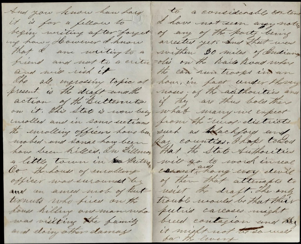 The all engrossing topic at present is the draft and the action of the “Butternuts” on it. This State is now being enrolled and in some sections the enrolling officers have been mobbed and some have been killed. In Fillmore—a little town in Putnam county—the house of the enrolling officer was surrounded by an armed mob of Butternuts who fired on the house killing one man who was visiting the family and doing some other damage to a considerable extent. I have not seen any notice of any of the party being arrested yet. And that was within thirty miles of Indianapolis on the railroad where they can run troops in an hour. In fact, under the very noses of the authorities, and if they are thus bold there, what may we expect from the rural districts such as Blackford and Jay counties?