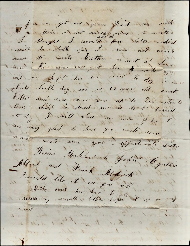 There is not much news to write. I thought I would write but one letter which will do both for I have not much news to write. Esther is not at home now. Jim came and got her 4 weeks ago and has kept her ever since. Today is Rose Stout’s birthday. She is 12 years old. Aunt Ether and Rose have gone up to Ira Stout’s. Their child is dead and is to be buried today.