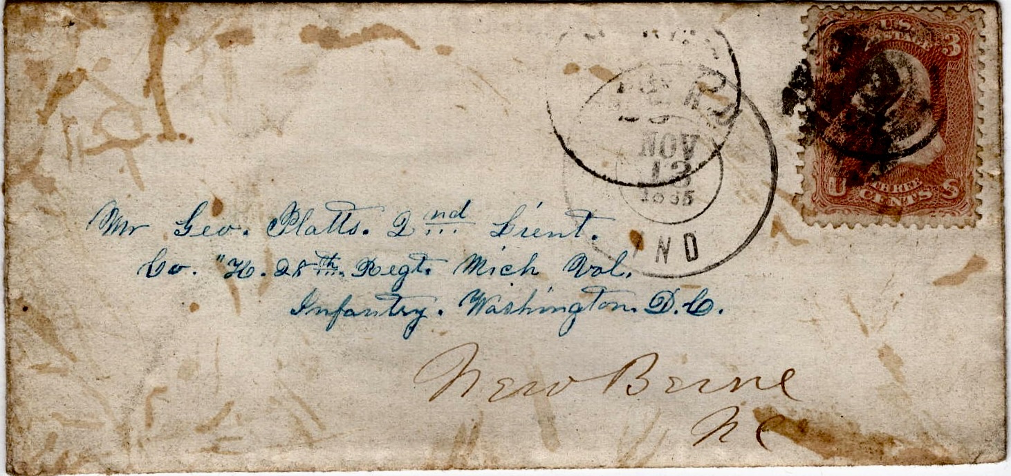 Addressed to Mr. George Platts, 2nd Lieutenant, Colonel. H, 28th Regt. Michigan Volunteer Infantry, Washington D. C.