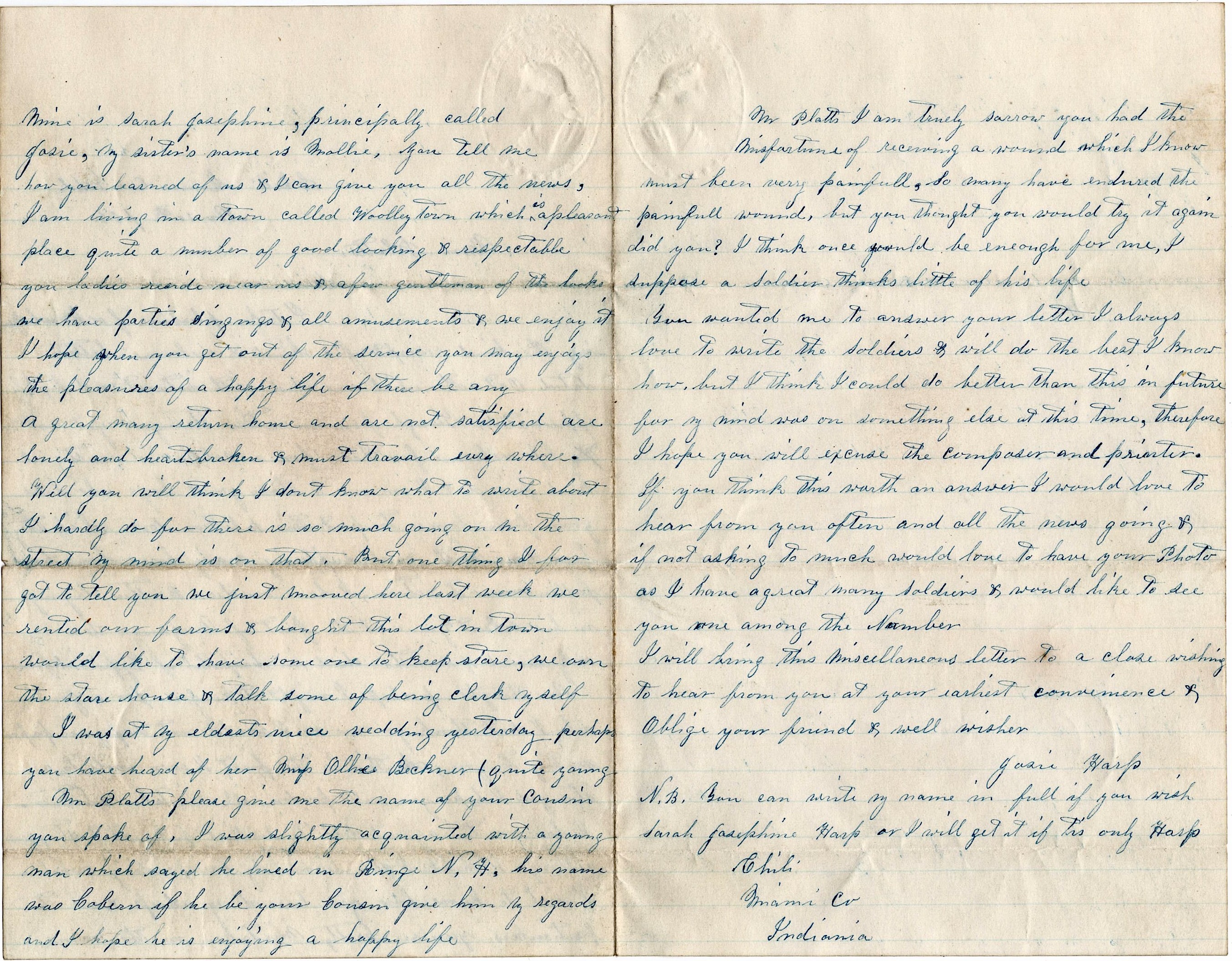 N. B. You can write my name in full if you wish—Sarah Josephine Harp, or I will get it if tis only Harp, Chili, Miami county, Indiana