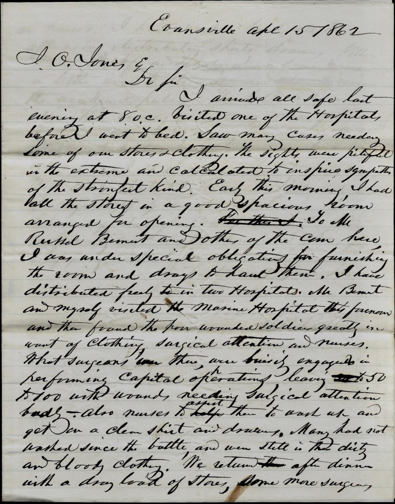 From Samuel’s letter we can infer that he was a volunteer in a soldier’s aid society—probably the Terre Haute Sanitary Committee—attending to the wounded soldiers in hospitals in and around Evansville, Indiana, still arriving from the Shiloh battlefield. C. Russell Bement is mentioned in this letter and he was a member of the Evansville Sanitary Commission’s Board of Directors. Samuel wrote the letter to J. O. Jones who served as the Post Master in Terre Haute, Indiana.
