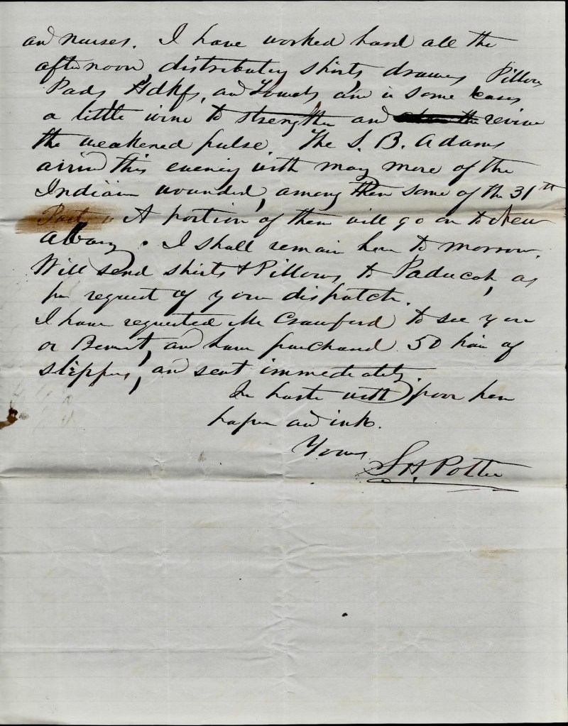We returned after dinner with a dray load of stores, some more surgeons and nurses. I have worked hard all the afternoon distributing shirts, drawers, pollows, pads, handkerchiefs, and towels, and in some cases a little wine to strengthen and revive the weakened pulse. The S. B. Adams arrived this evening with many more of the Indiana wounded, among them some of the 31st [Indiana Infantry]. A portion of them will go on to New Albany.