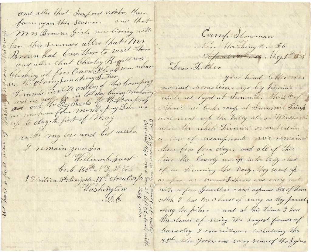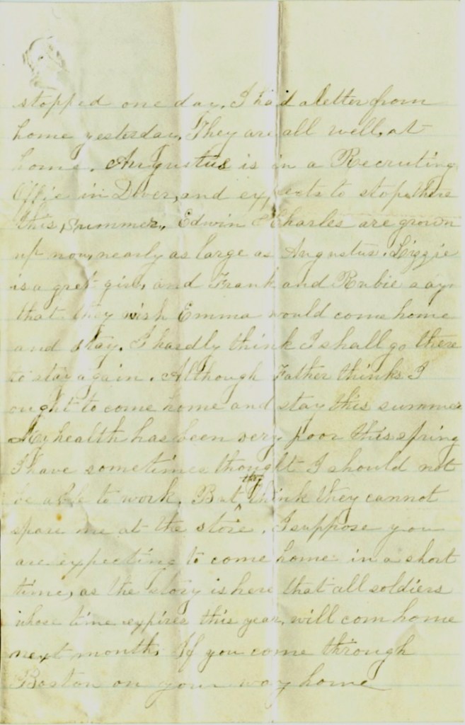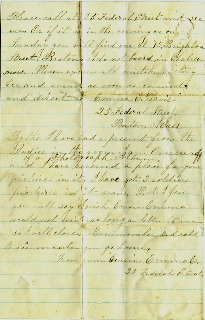 This letter was once in a large collection of letters to and from his fiancée, Hattie Crandall. Two letters from Hattie to Edwin refer to major war-related events in 1865. In a letter dated April 23, 1865, Hattie laments the tragic death of President Lincoln: “the just God takes those who can be least spared and so at this final hour he permitted the hand of the assassin to strike down our President when he was so much needed and leave the country to mourn and well might the confederacy dress in mourning for they have lost their best friend, as well as the North.” In a June 18, 1865 letter to Adams, Hattie expressed joy at the capture of John Wilkes Booth in April and of Jefferson Davis in May. “I suppose the boys in the army will be coming home before many days at least they are looking for them around here. We can not complain of the good news in relation to the capture of ‘Jeff,’ it seems as if his capture and that of Booth and others would partially cancel the Death of our President.”