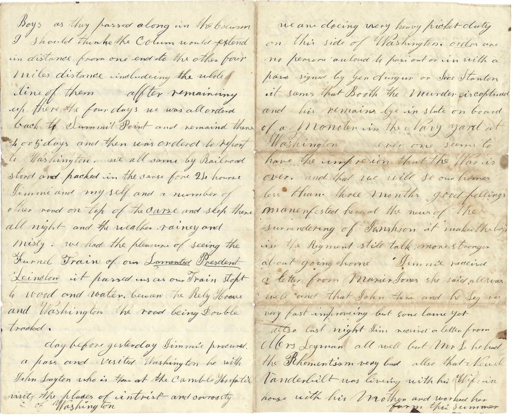 I suppose the boys in the army will be coming home before many days—at least they are looking for them around here. We can not complain of the good news in relation to the capture of “Jeff.” It seems as if his capture and that of Booth and others would partially cancel the death of our President.