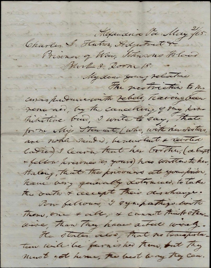 The restriction to my correspondence with rebels having been removed by the cancelling of my prohibitive [ ], I write to say that from Miss Stewart (who with her sisters are noble-minded, benevolent & devoted ladies), I learn that her brother (a Capt. & fellow prisoner of yours) has written to her stating that the prisoners at your prison have been generally determined to take the oath [of allegiance] and take their discharge.