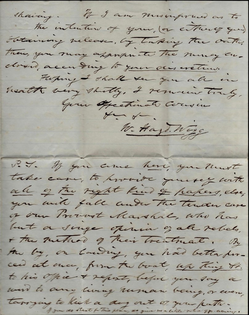 P. S. If you come here, you must take care to provide yourself with all of the right kind of papers, else you will fall under the tender care of our Provost Marshal who has but a single opinion of all rebels & the method of their treatment. By the by, on landing, you had better proceed at once from the boat up King Street to his office & report before you say a word to any living human being, or even tarrying to kick a dog out of your path. If you do start for this place, do give us a little notice of your coming.