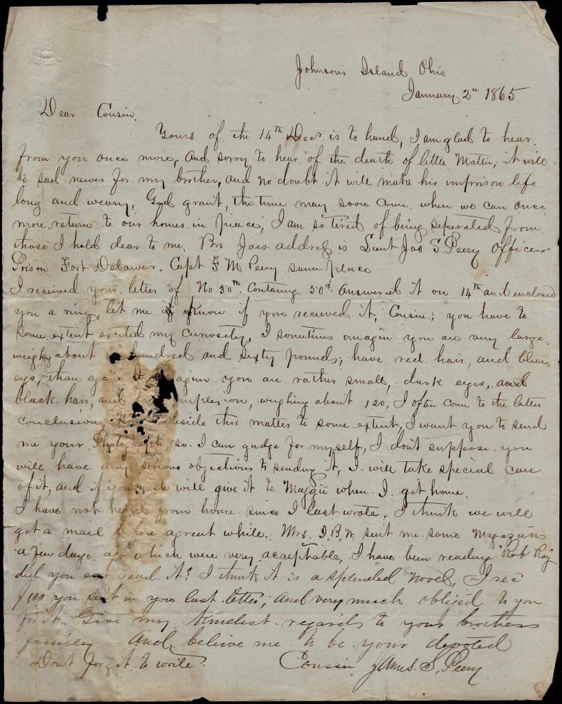 The following letter was written by James Spotts Peery (1837-1905) who entered the Confederate service as a 1st Lieutenant of Co. G, 45th Virginia Infantry in May 1861. By July 1862 he had been promoted to Captain of his company. He was wounded and taken prisoner on 5 June 1864 at Piedmont, Virginia, and transferred into the officer’s prison at Johnson’s Island (Ohio) on 22 June 1864 where he wrote this letter in January 1865.
