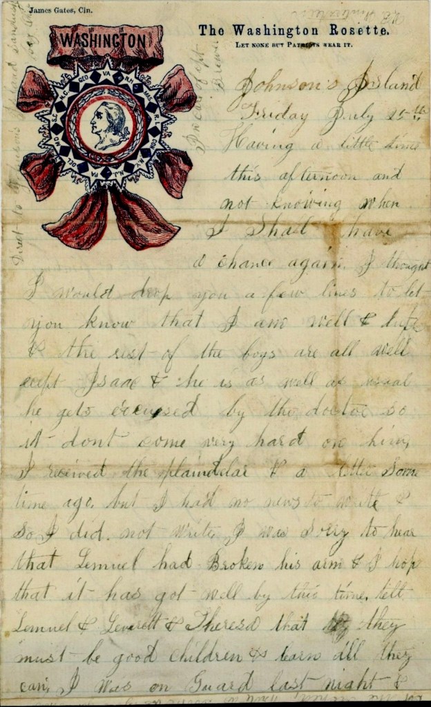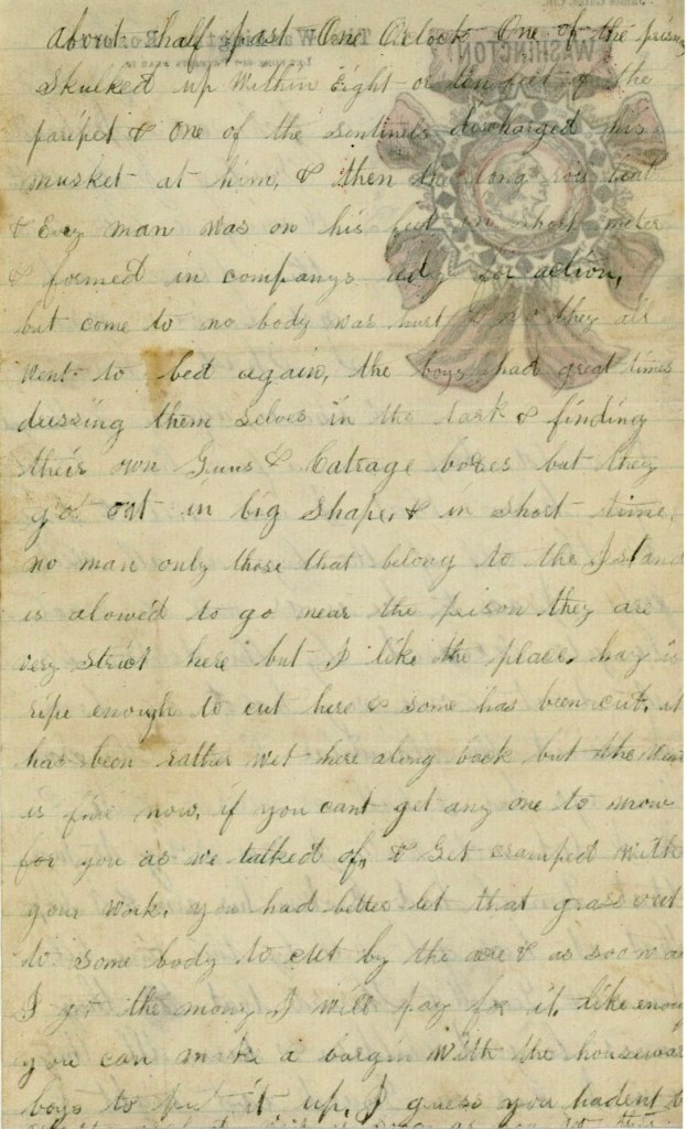 I was on guard last night & about half past one o’clock one of the prisoners skulked up within eight or ten feet of the parapet & one of the sentinels discharged his musket at him, and then the long roll beat & every man was on his feet in short meter & formed in companies ready for action. But come to nobody was hurt & so they all went to bed again. The boys had great times dressing themselves in the dark and finding their own guns and cartridge boxes but they got out in big shape & in short time. No man—only those that belong to the Island—is allowed to go near the prison. They are very strict here but I like the place.