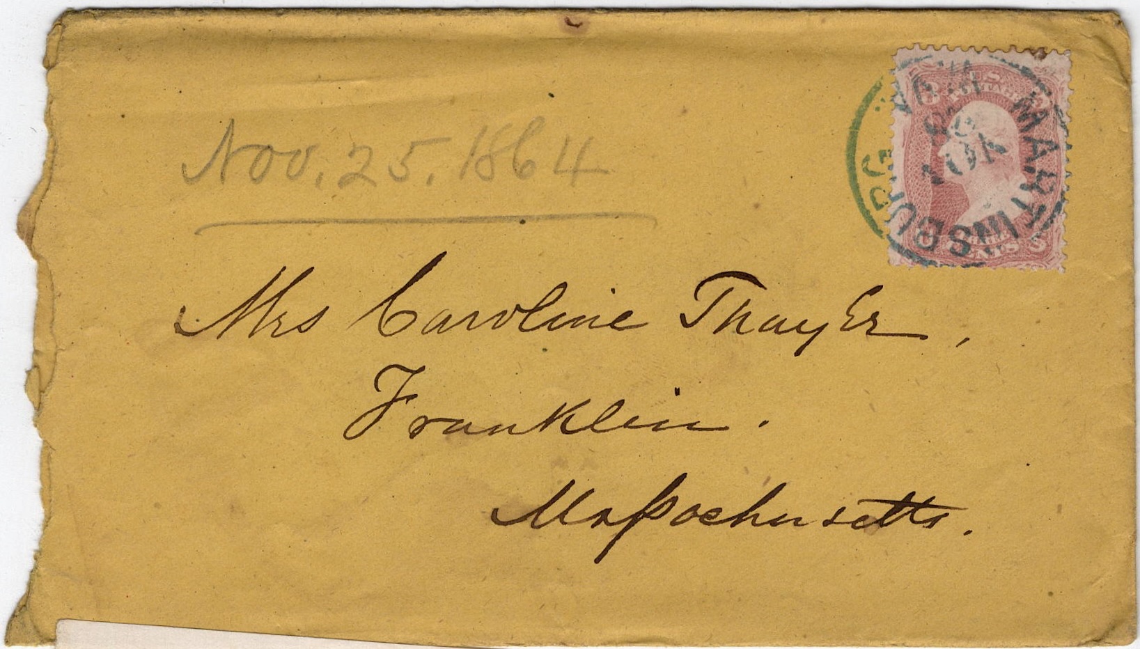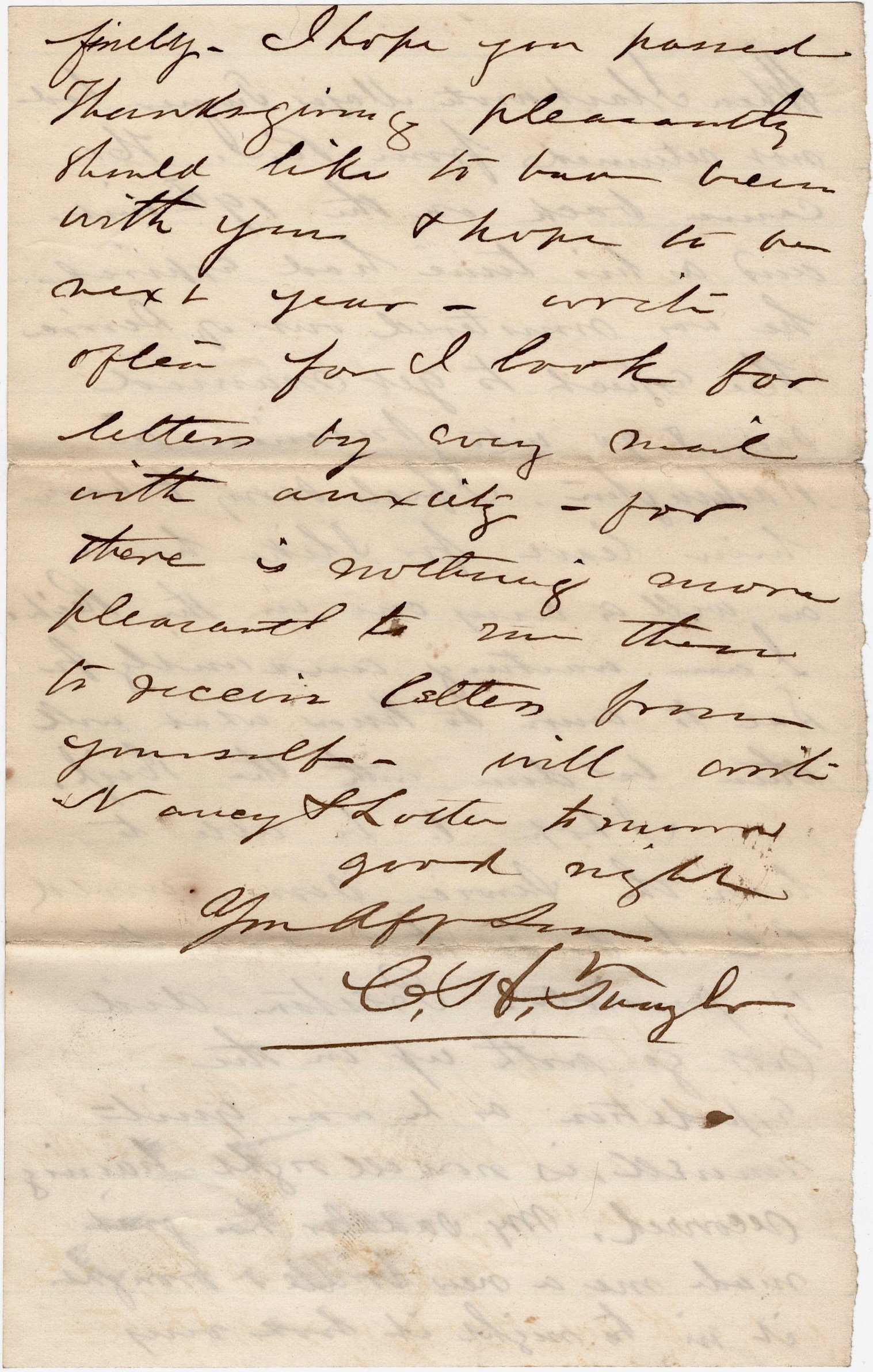 I hope you have passed Thanksgiving pleasantly. Should like to have been with you & hope to be next year. Write often for I look for letters by every mail with anxiety for there is nothing more pleasant to me than to receive letters from yourself. Will write Nancy & Lottie tomorrow. Your affectionate son, — C. H. Thayer