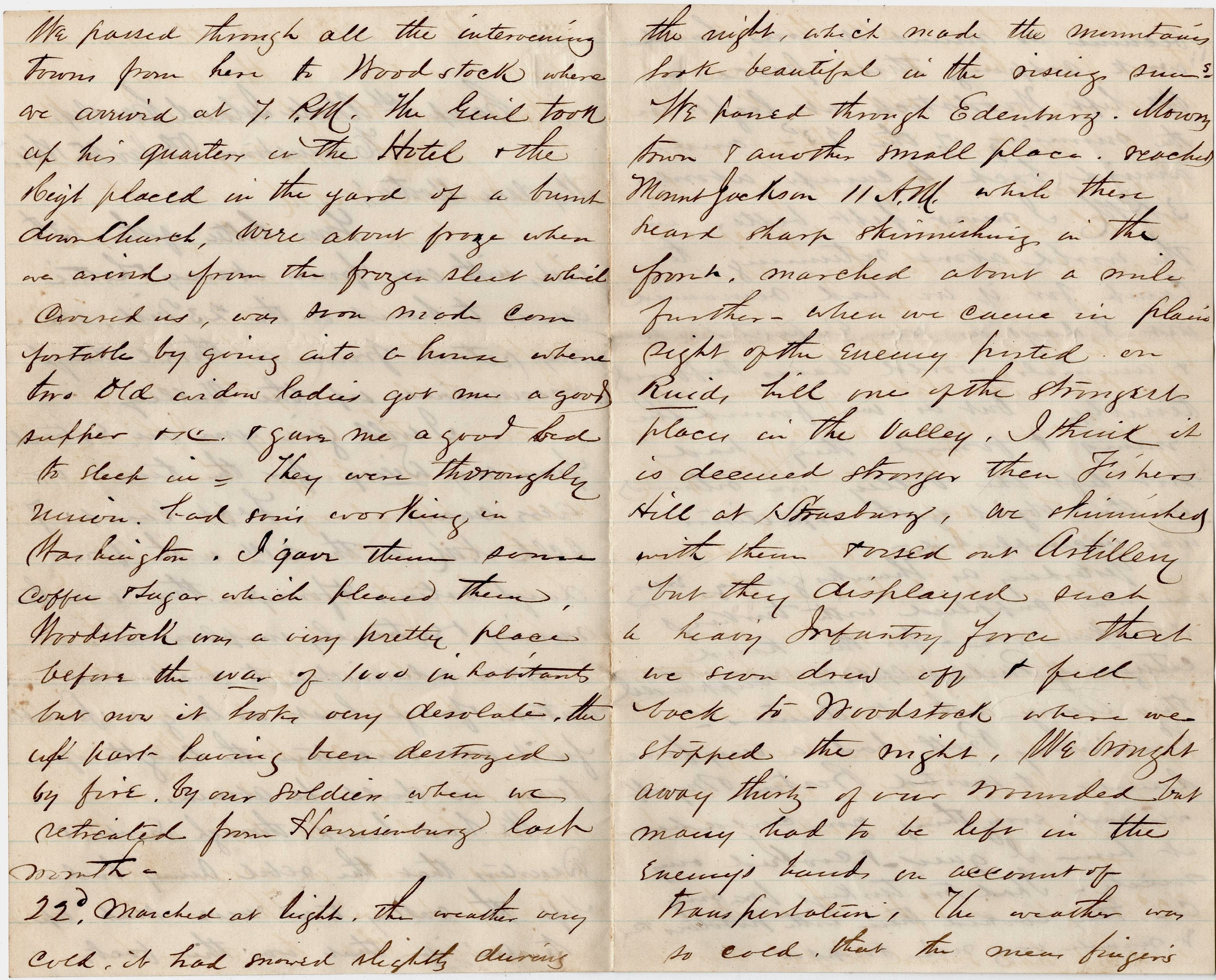 We had heard through scouts and deserters that the rebel army had left the Valley and we were sent up to see if that was the fact. We passed through all the intervening towns from here to Woodstock where we arrived at 7 p.m. The General took up his quarters in the hotel & the regiment placed in the yard of a burnt down church. Were about froze when we arrived from the frozen sleet which covered us. Was soon made comfortable by going into a house where two old widow ladies got me a good supper, &c. and gave me a good bed to sleep in. They were thoroughly Union. Had sons working in Washington. I gave them some coffee and sugar which pleased them. Woodstock was a very pretty place before the war of 1,000 inhabitants but now it looks very desolate—the up[town] part having been destroyed by fire by our soldiers when we retreated from Harrisonburg last month.