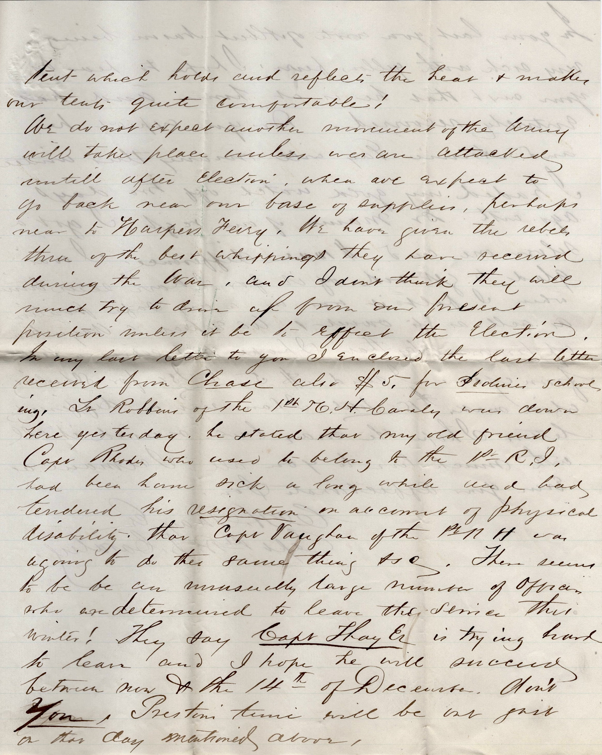 We do not expect another movement of the army will take place unless we are attacked until after election when we expect to go back near to Harper’s Ferry. We have given the rebels three of the best whippings they have received during the war and I don’t think they will much try to drive us from our present position unless it be to effect the election.