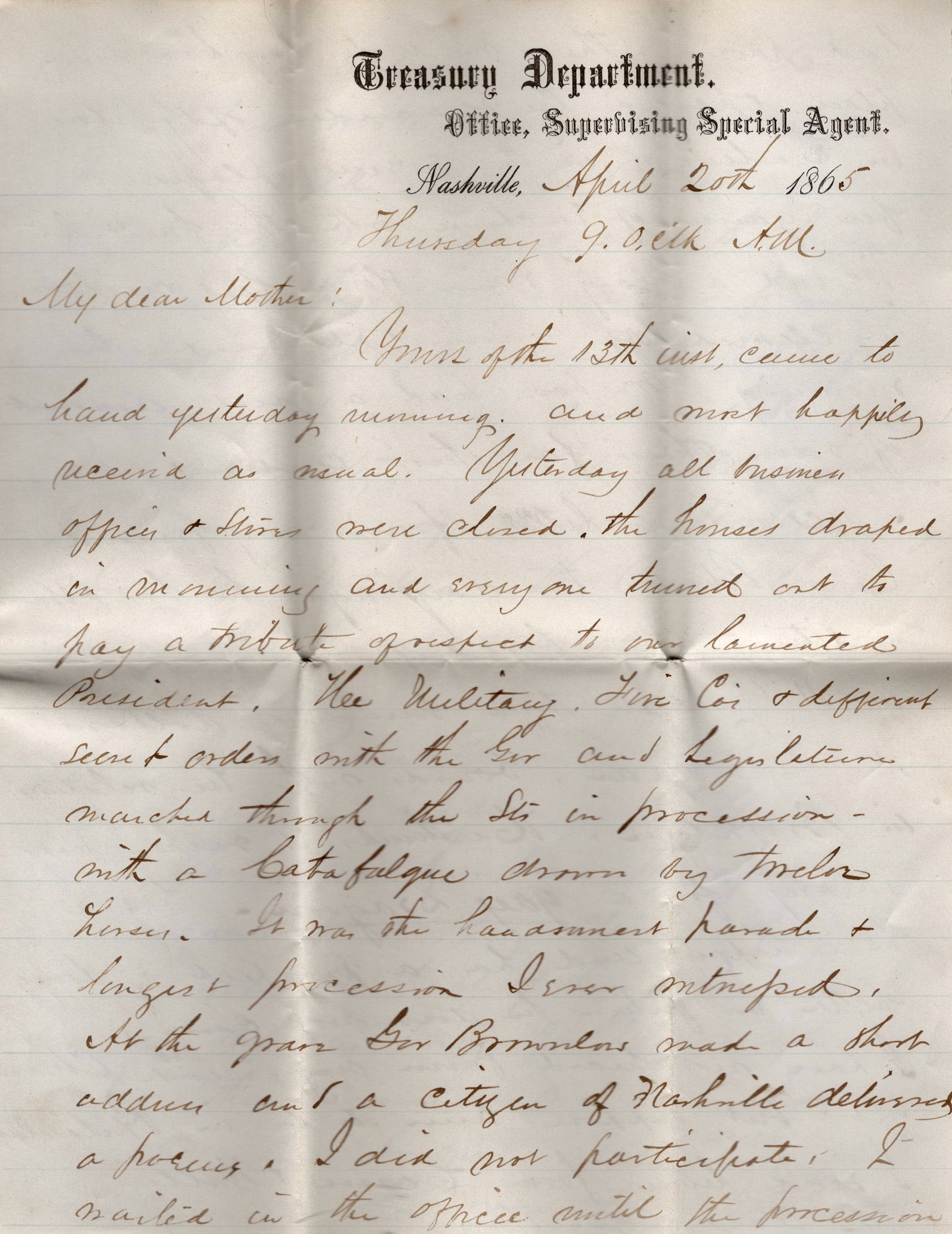 Treasury Department Office, Supervising Special Agent Nashville, [Tennessee] April 20th 1865 Thursday, 9 o’clock a.m.