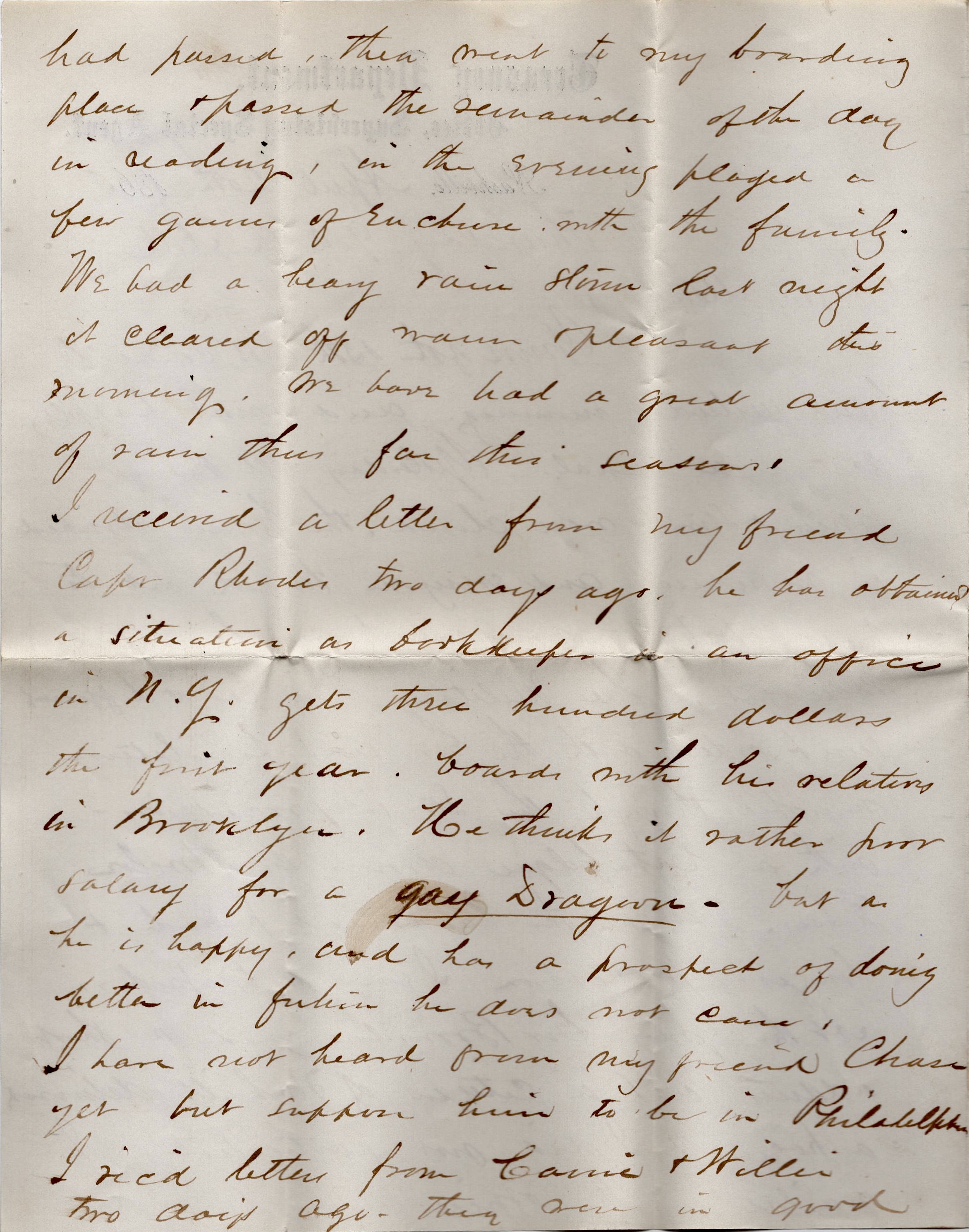 I received a letter from my friend Capt. Rhodes two days ago. He has obtained a situation as bookkeeper in an office in New York. Gets three hundred dollars the first year. Boards with his relations in Brooklyn. He thinks it rather poor salary for a gay Dragon but as he is happy and has a prospect of doing better in future, he does not complain…