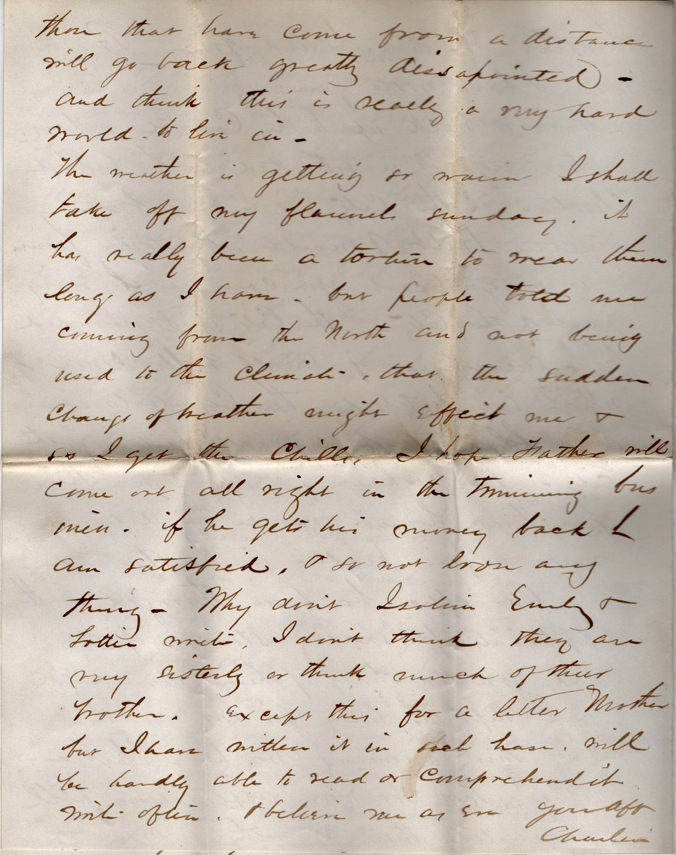 Write to me often, Mother, and tell the girls to do the same and I shall answer immediately. With much love to you all. I remain your affectionate son, — Charlie