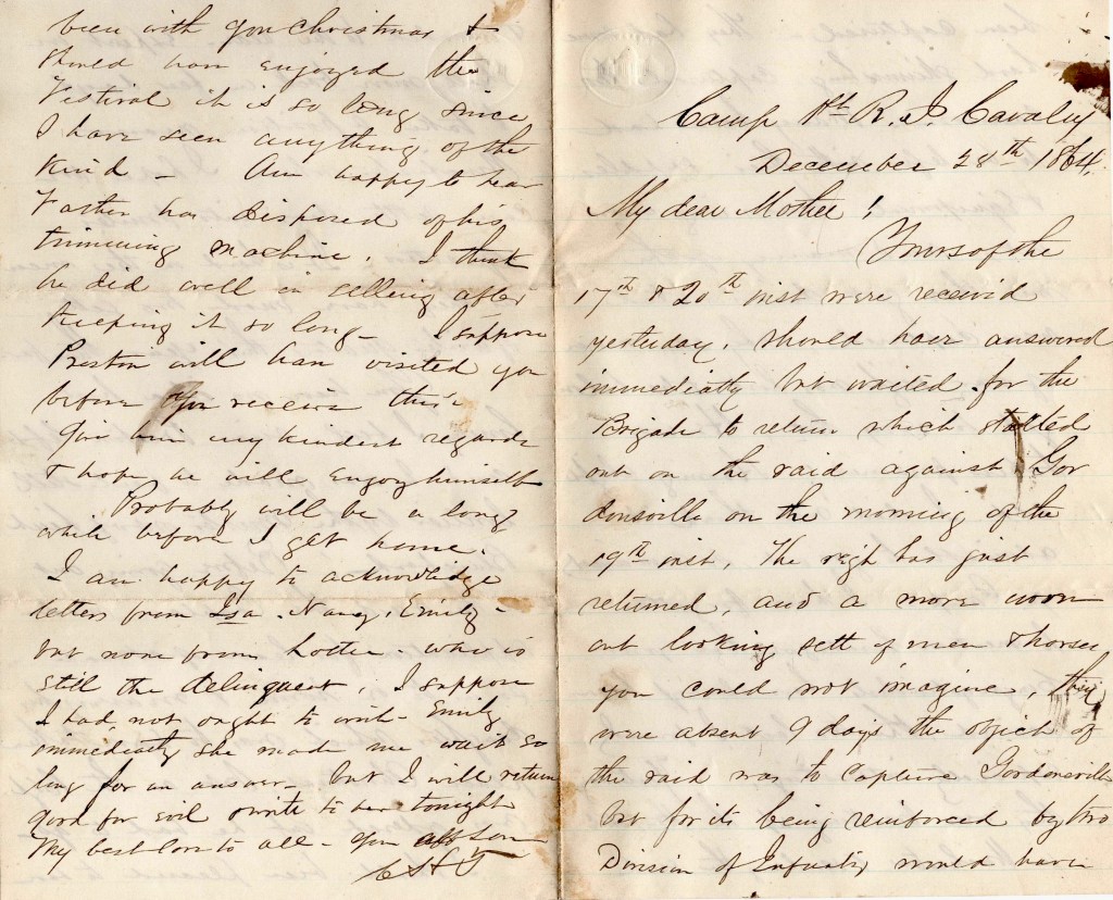 Yours of the 17th and 20th inst. were received yesterday. Should have answered immediately but waited for the Brigade to return which started out on the raid against Gordonsville on the morning of the 19th inst. The regiment has just returned and a more worn out looking set of men & horses you could not imagine. They were absent 9 days. The objet of the raid was to capture Gordonsville but for its being reinforced by two divisions of infantry would have been captured. They had some hard skirmishing [and] captured two cannon. Many horses had to be left with their saddles & equipments becoming worn out, and many of the men that got dismounted were captured. Only one man of our regiment was lost & he belonged to my company. He was taken prisoner. Having a slight cold, I did not think it advisable to go out, so remained in camp.