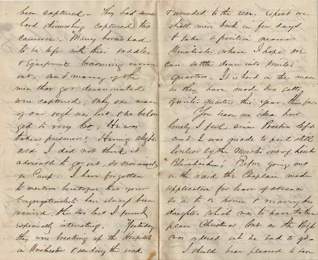 You have no idea how lonely I feel since Preston left and I was made to feel still lonelier by the muster out of Lt. Blanchard. Before going out on the raid, the Chaplain made application for leave of absence so as to be home and marry his daughter which was to have taken place Christmas but as the regiment was ordered out, he had to go.