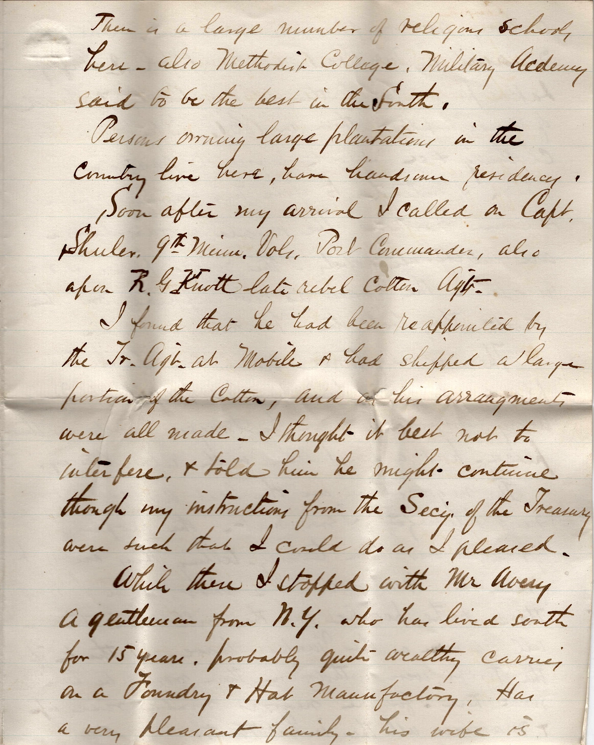 Soon after my arrival I called on Capt. [Benjamin P.] Shuler, 9th Minnesota Vols., Post Commander. Also upon R. G. Knott, late rebel cotton agent. I found that he he had been re-appointed by the [ ] Agent at Mobile & had shipped a large portion of the cotton and as his arrangements were all made, I thought it best not to interfere & told him he might continue though my instructions from the Secretary of the Treasury were such that I could do as I pleased.
