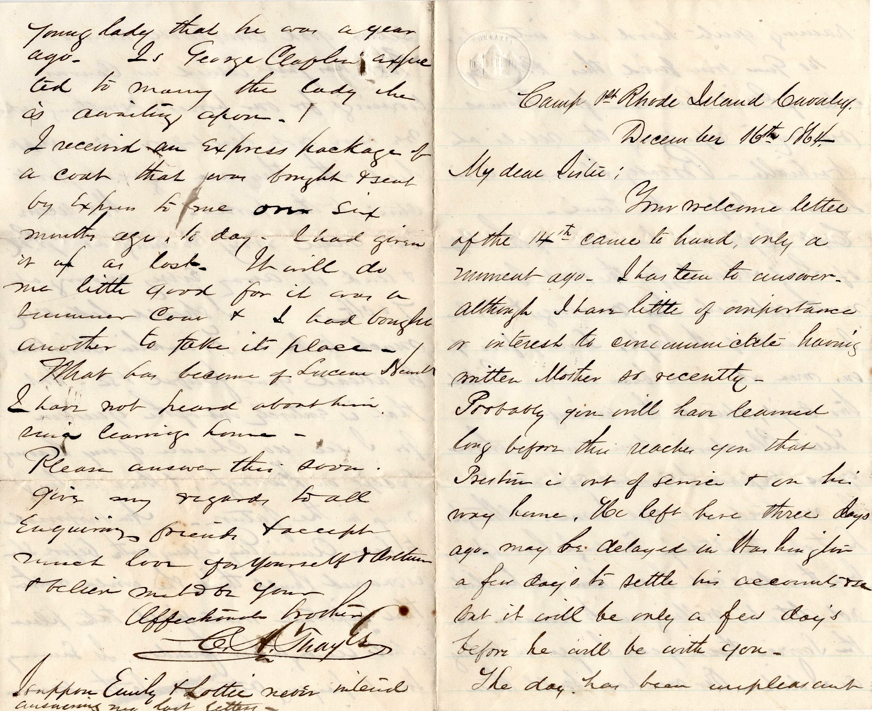 I have your last letter now in my pocket & will now take it out and re-read it & see what if there is any questions to answer. It is dated the 18th of September. Your camp meeting held near Amos’s farm did not turn out very nicely I should think from what you wrote. We are expecting a train up tomorrow by which I hope to get letters from you & my sisters. Write me often as possible & I will do the same. With much love, I remain. Your affectionate son, — C. H. Thayer, Capt., 1st R. I. Cavalry