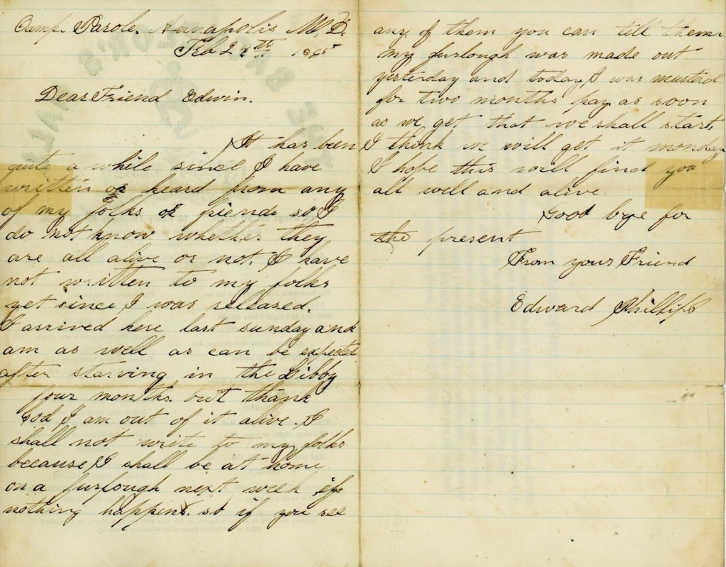 It has been quite a while since I have written or heard from any of my folks or friends so do not know whether they are all alive or not. I have not written to my folks yet since I was released. I arrived here last Sunday and am as well as can be expected after starving in the Libby four months but thank God I am out of it alive. I shall not write to my folks because I shall be at home on a furlough next week if nothing happens. If you see any of them, you can tell them my furlough was made out yesterday and today I was mustered for two months pay. As soon as we get that, we shall start. I think it we will get it Monday. I hope this will find you all well and alive. Goodbye for the present. From your friend, — Edward Phillips