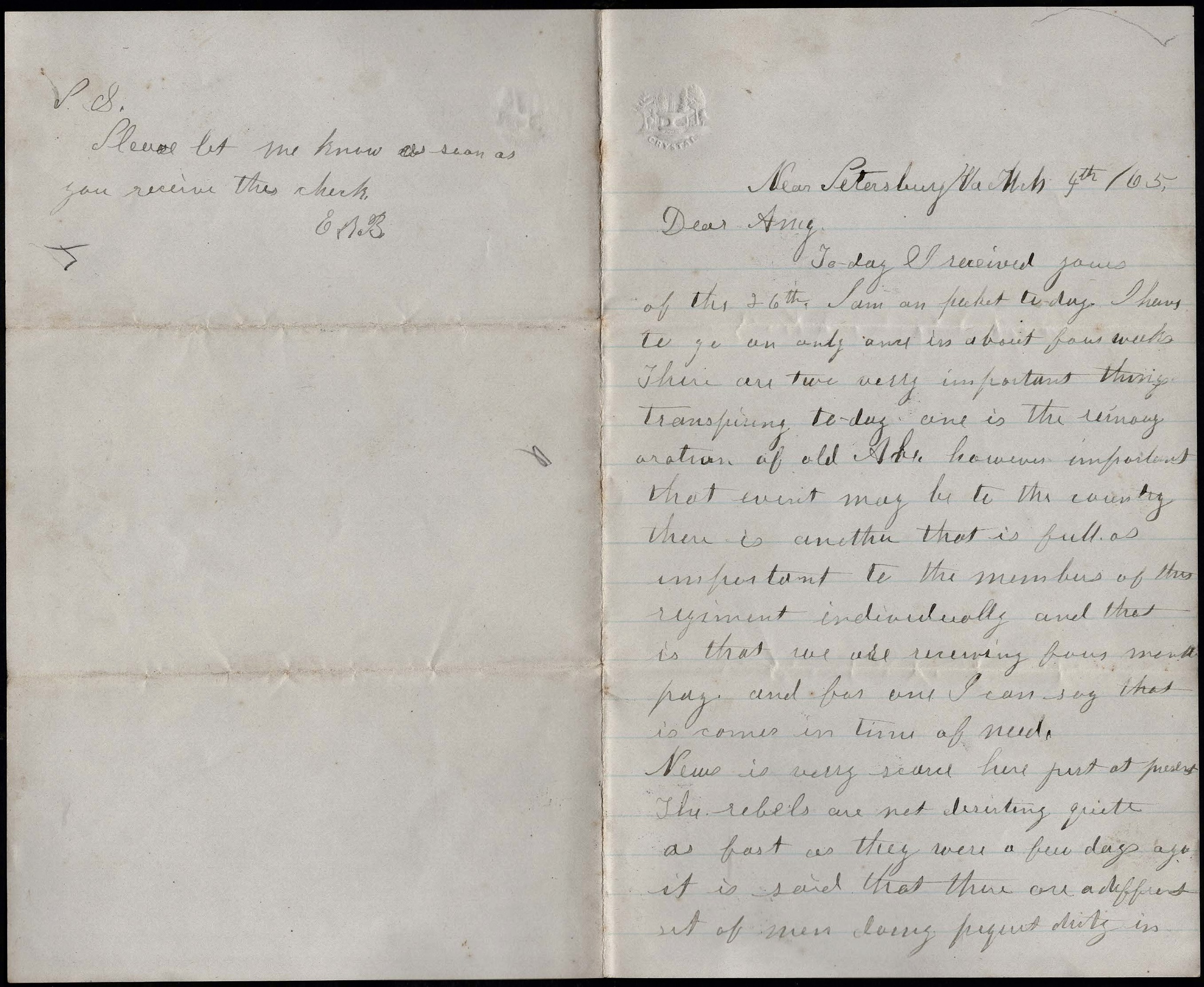 Edwin was with the regiment from the time they fought at Rappahannock Station in November 1863 through the Battle of Sailor’s Creek in April 1865. In the second letter, he describes the mood of the army following the assassination of President Lincoln and shares portions of conversations he’s had with rebel soldiers going home following Lee’s surrender.