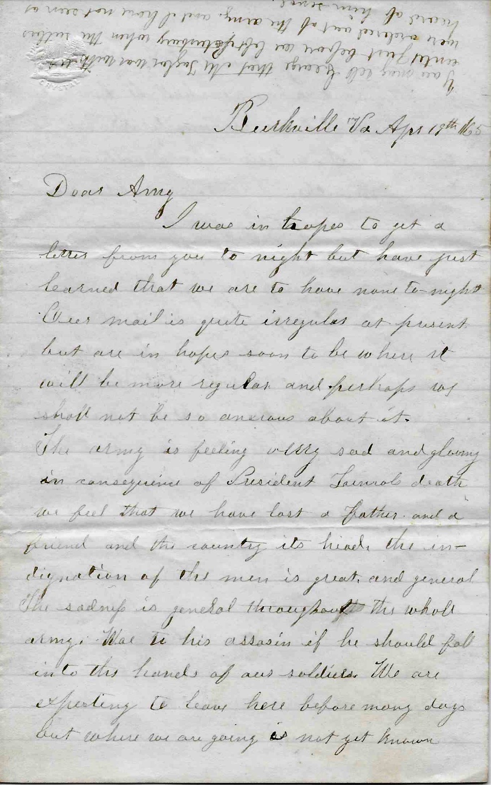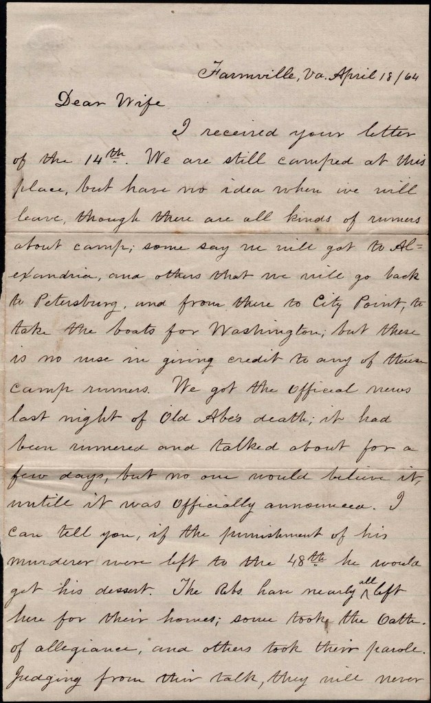 I hope these few lines will find you and Dan in good health. Your family is all well. We have news that the war is over. Mobile gave up. So far so good. But the news of the murder of Abe Lincoln is not so good.