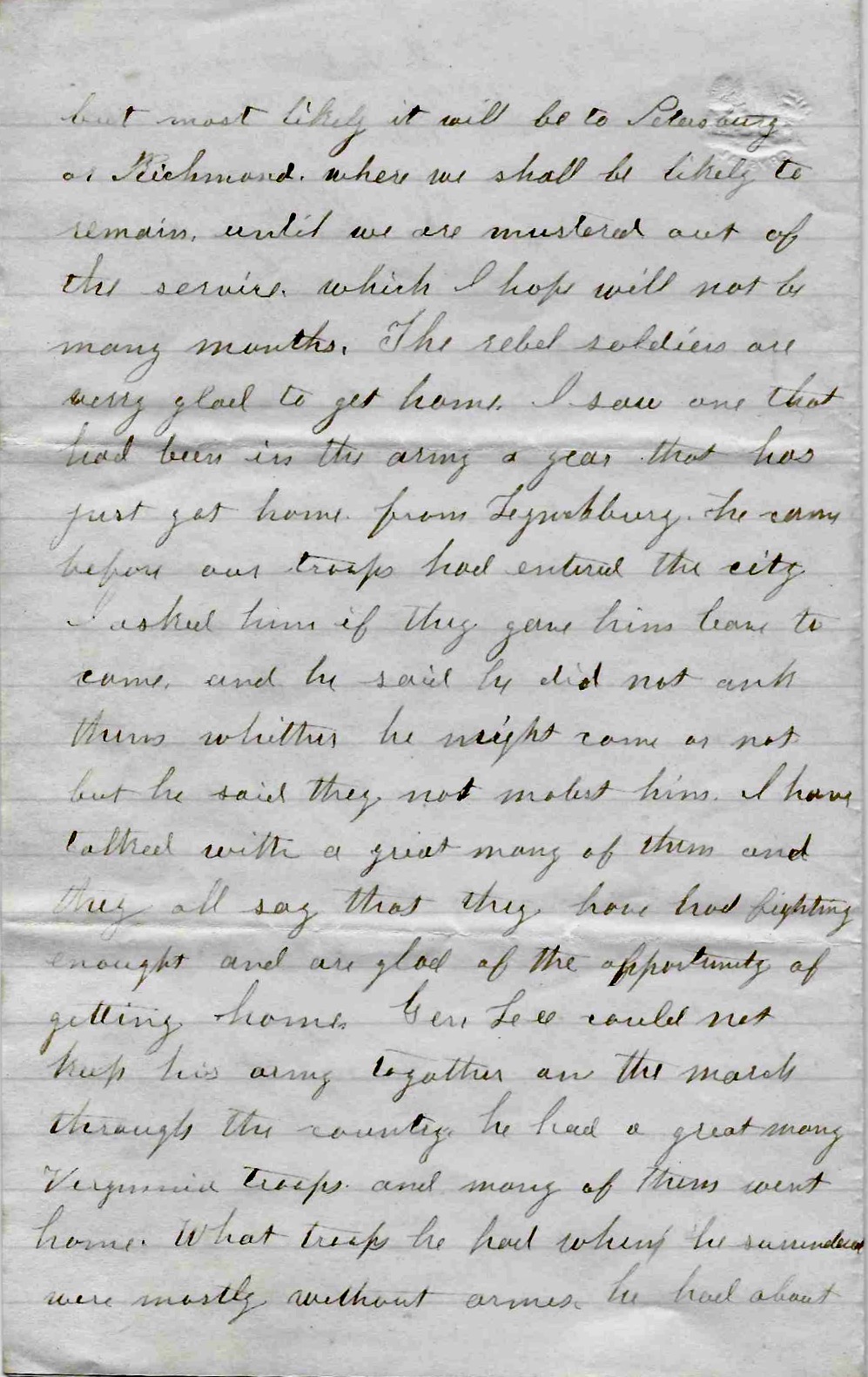We are expecting to leave here before many days but where we are going is not yet known but most likely it will be to Petersburg or Richmond where we shall be likely to remain until we are mustered out of the service which I hope will not be many months. The rebel soldiers are very glad to get home. I saw one that had been in the army a year that has just got home from Lynchburg. He came before our troops had entered the city. I asked him if they gave him leave to come and he said he did not ask them whether he might come or not but he said they [did] not molest him. I have talked with a great many of them and they all say that they have had fighting enough and are glad of the opportunity of getting home.