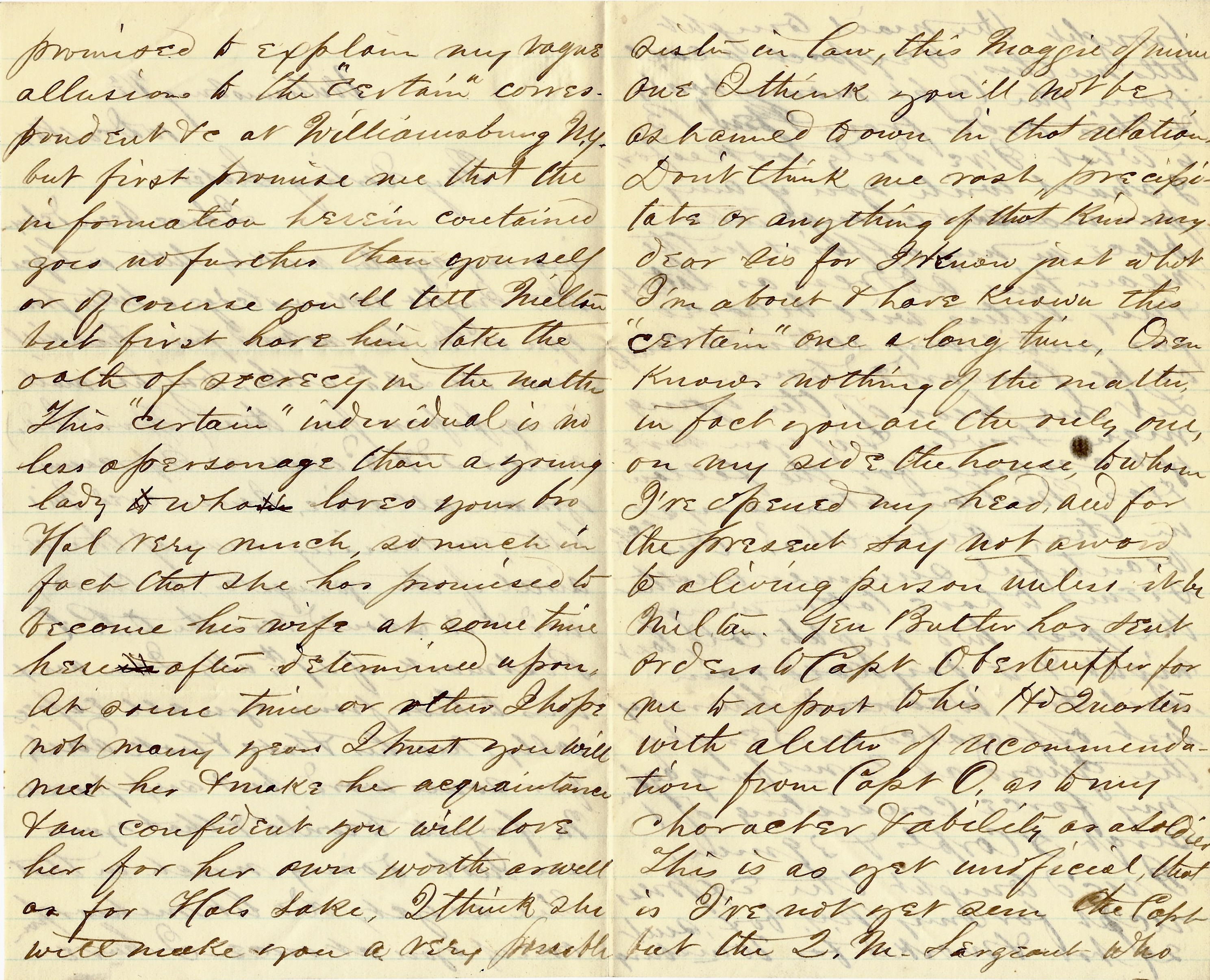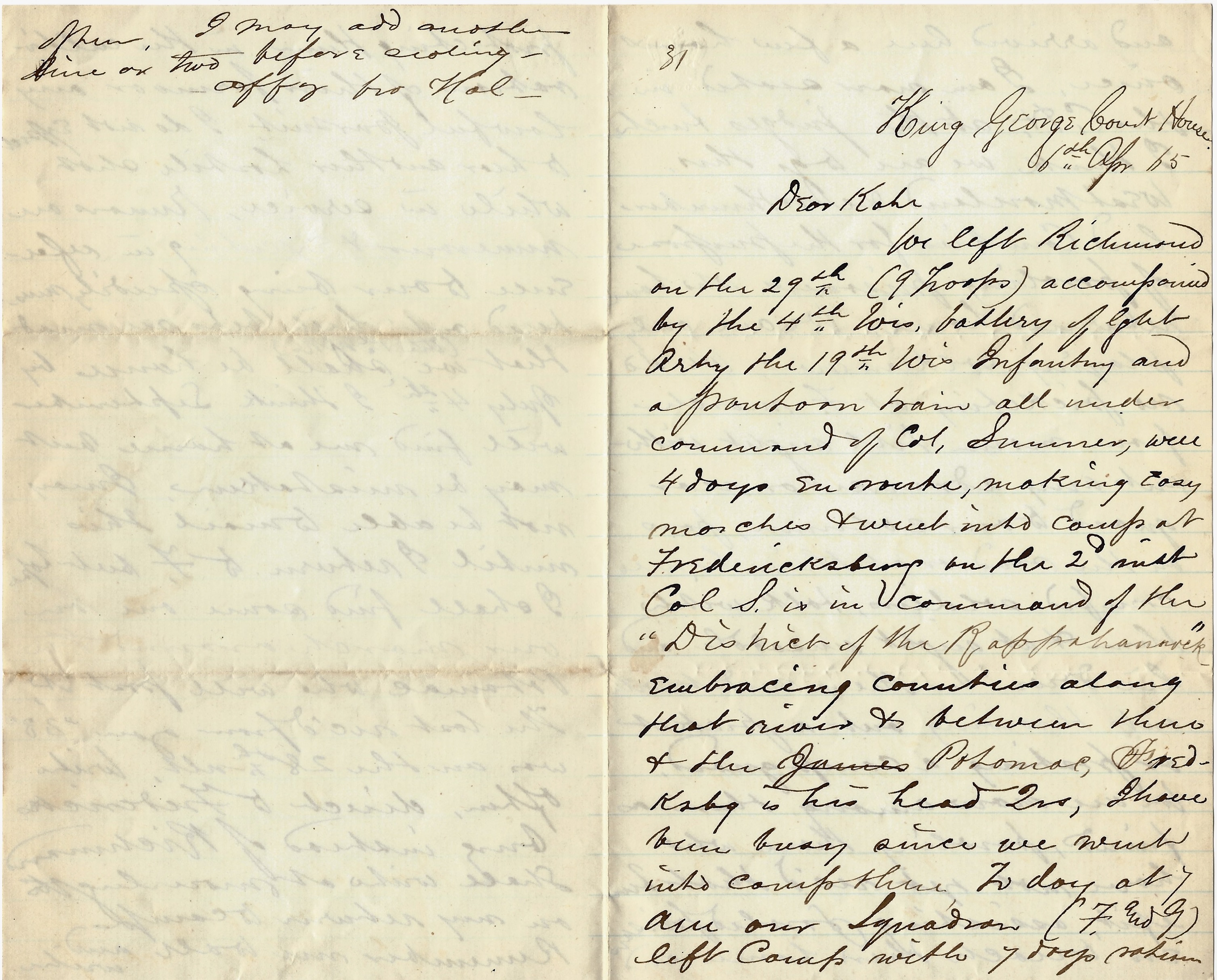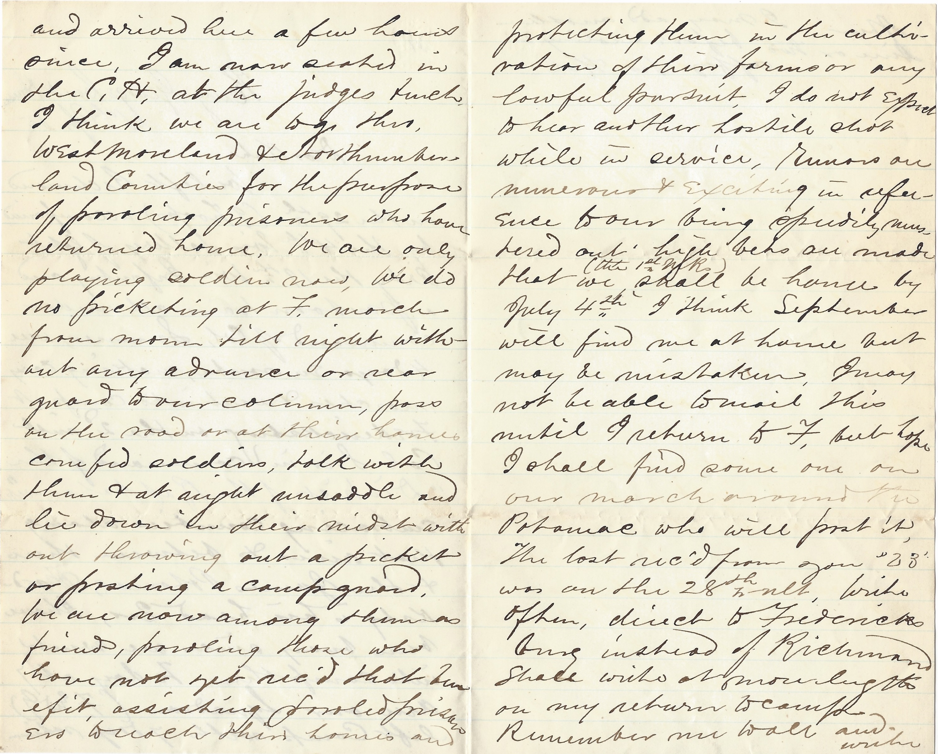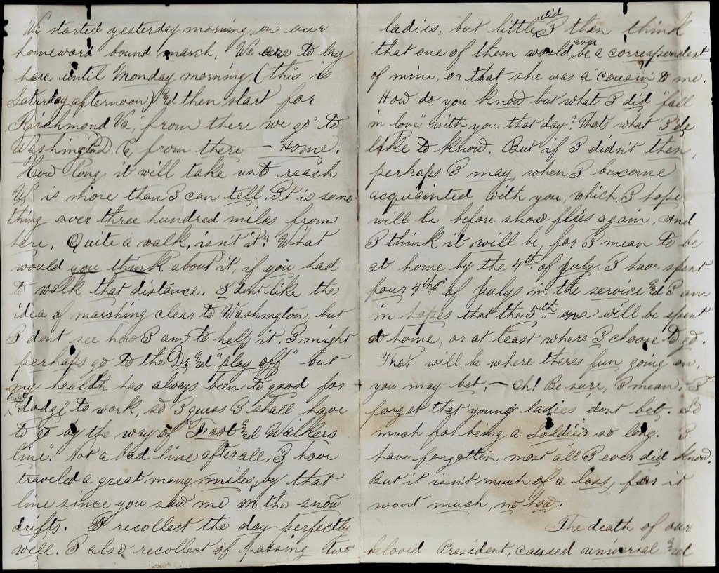 We started yesterday morning on our homeward bound march. We are to lay here until Monday morning (this is Saturday afternoon) and then start for Richmond, Virginia. From there we go to Washington D. C. and from there—home. How long it will take us to reach Washington is more than I can tell. It is something over three hundred miles from here. Quite a walk, isn’t it? What would you think about it if you had to walk that distance? I don’t like the idea of marching clear to Washington but I don’t see how I am to help it. I might perhaps go to the doctor and “play off” but my health has always been too good for that “dodge” to work so I guess I shall have to go by the way of “Fast and Walker’s line.” Not a bad line after all. I have traveled a great many miles by that line since you saw me on the snow drifts. I recollect the day perfectly well. I also recollect of passing two ladies but little did I then think that one of them would ever be a correspondent of mine, or that she was a cousin to me. How do you know but what I did “fall in love” with you that day? What’s what I’d like to know. But if I didn’t, then perhaps I may when I become acquainted with you which I hope will be before snow flies again. And I think it will be for I mean to be at home by the 4th of July. I have spent four 4th of July’s in the service and I am in hopes that the 5th one will be spent at home, or at least where I choose to go. That will be where there’s fun going on, you may bet. Oh! Be sure, I mean, I forget that young ladies don’t bet. So much for being a soldier so long. I have forgotten most all I ever did know. But it isn’t much of a loss for it want much no how.