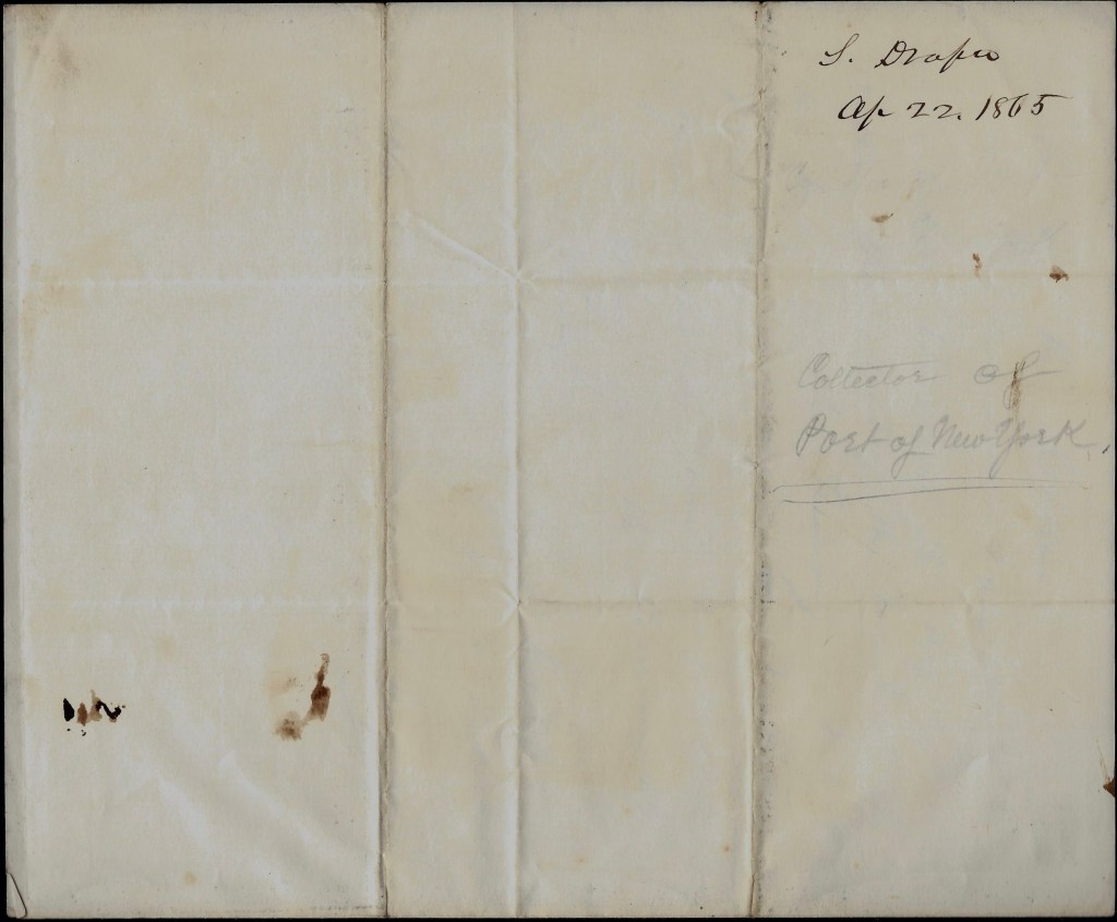 The following letter, bordered in black, was written by Simeon Draper (1806-1866), the Collector of Customs at New York, a week after the assassination of Abraham Lincoln. He wrote the letter to the Hon. William Pitt Fessenden, who as Secretary of the Treasury in the Lincoln Administration had been instrumental in securing Draper the coveted patronage post in 1864. As a successful businessman and the former chairman of the New York State Republican Party, Draper enjoyed the support of Secretary of State Seward and was at the center of New York’s business, political, and social scene. Not everyone in Lincoln’s cabinet thought favorably of Draper, however. Gideon Wells believed him to be swindler and in fact, a post-war investigation revealed that Draper was guilty of diverting some of the proceeds of the confiscated cotton from the U.S. Treasury to his personal use. It’s believed that when Lincoln wished to remove Draper from the post, Seward “wouldn’t let the President do it.” Draper was finally replaced as the Collector in August 1865 by Preston King—the “intimate friend and constant companion” of Andrew Johnson.