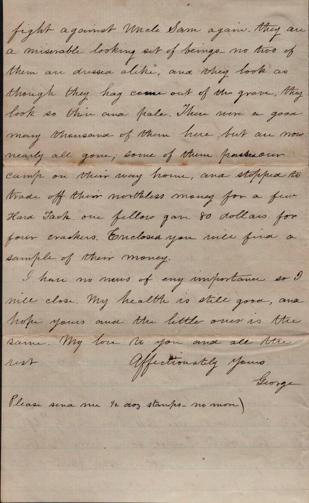 P. S. I enclose a genuine $1 Confederate States note. Keep on exhibition away from the destructive hands of the infant.