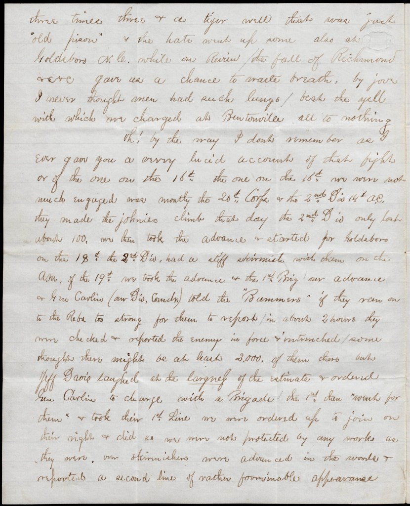 Your kind and truly welcome favor of the 16th inst. has just come to hand and I hasten to write a few lines in reply to it. Your letter found me lying in my tent, some six miles from the city of Raleigh, North Carolina. I am in the best of health and spirits as we are now on our way home. Home sweet home. There is no place like home.