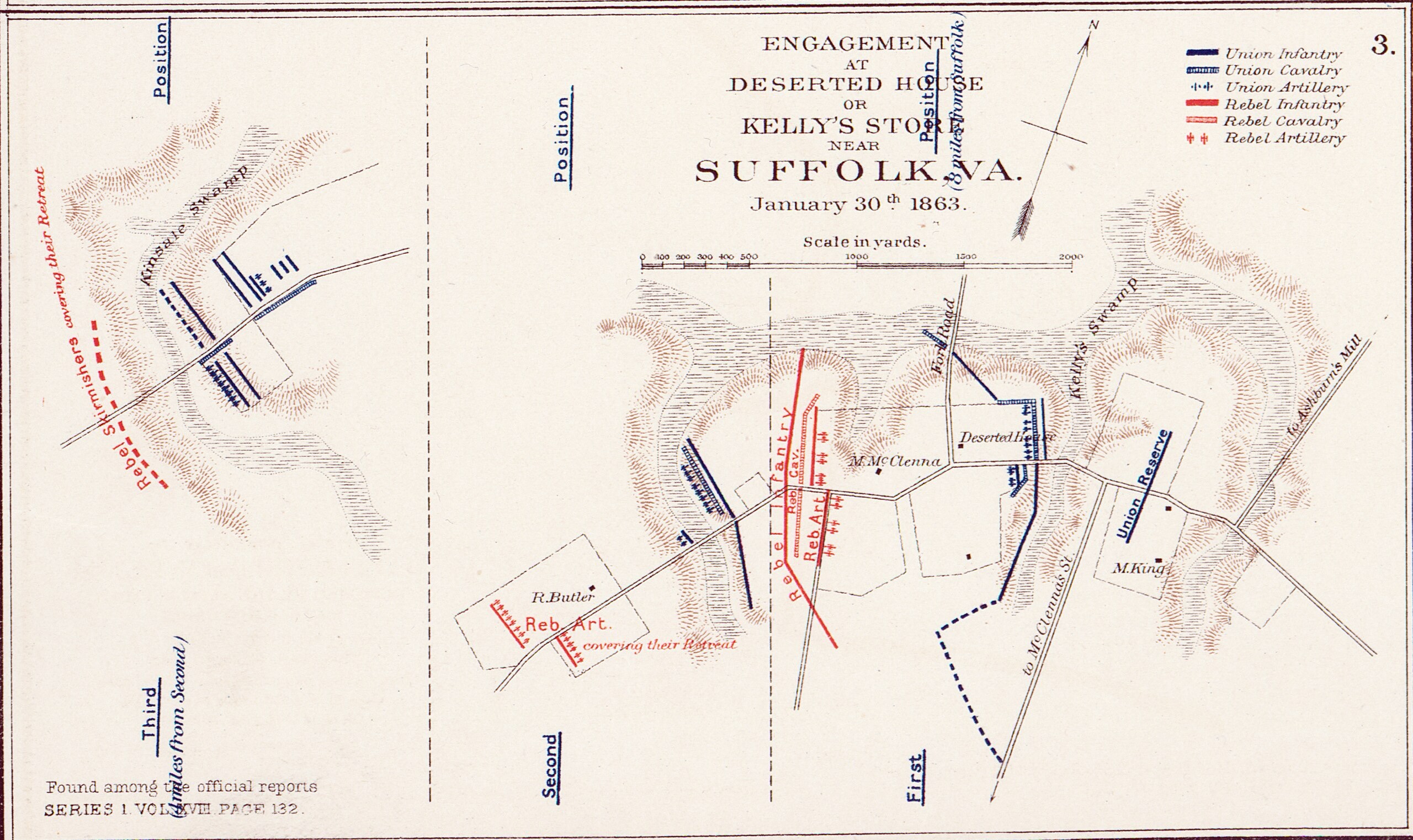 Have had some experience in scouting but find it somewhat fatiguing, though I shall work in no doubt. Friday night, just after we had become nicely settled in our bunks and lights all out, orders came hurriedly for every man to “turn out.” Four or five companies had during the day gone off on a scout and those remaining in camp, some 5 or 6. were quickly in saddle, in line in their respective streets. We were shortly on the road going west & south though we knew not for what purpose. Twas a beautiful night, bright moonlight. About 8 miles out of Suffolk, we met an ambulance containing one man killed and four wounded. Twelve miles out we met the “Harlan” Cavalry returning. Also four cannon bringing up the rear. From them we learned that there had been an engagement at Franklin (Va. or N. C.) near the “Blackwater” River that afternoon. Three brigades of infantry remained on the field but as there was no use there for cavalry, the 11th Pennsylvania [Cavalry] were bound for home, though why the artillery returned, I know not. We continued on till daylight when our companies were separated and Troop G turned off the road into a cornfield & fed, still remaining in line.