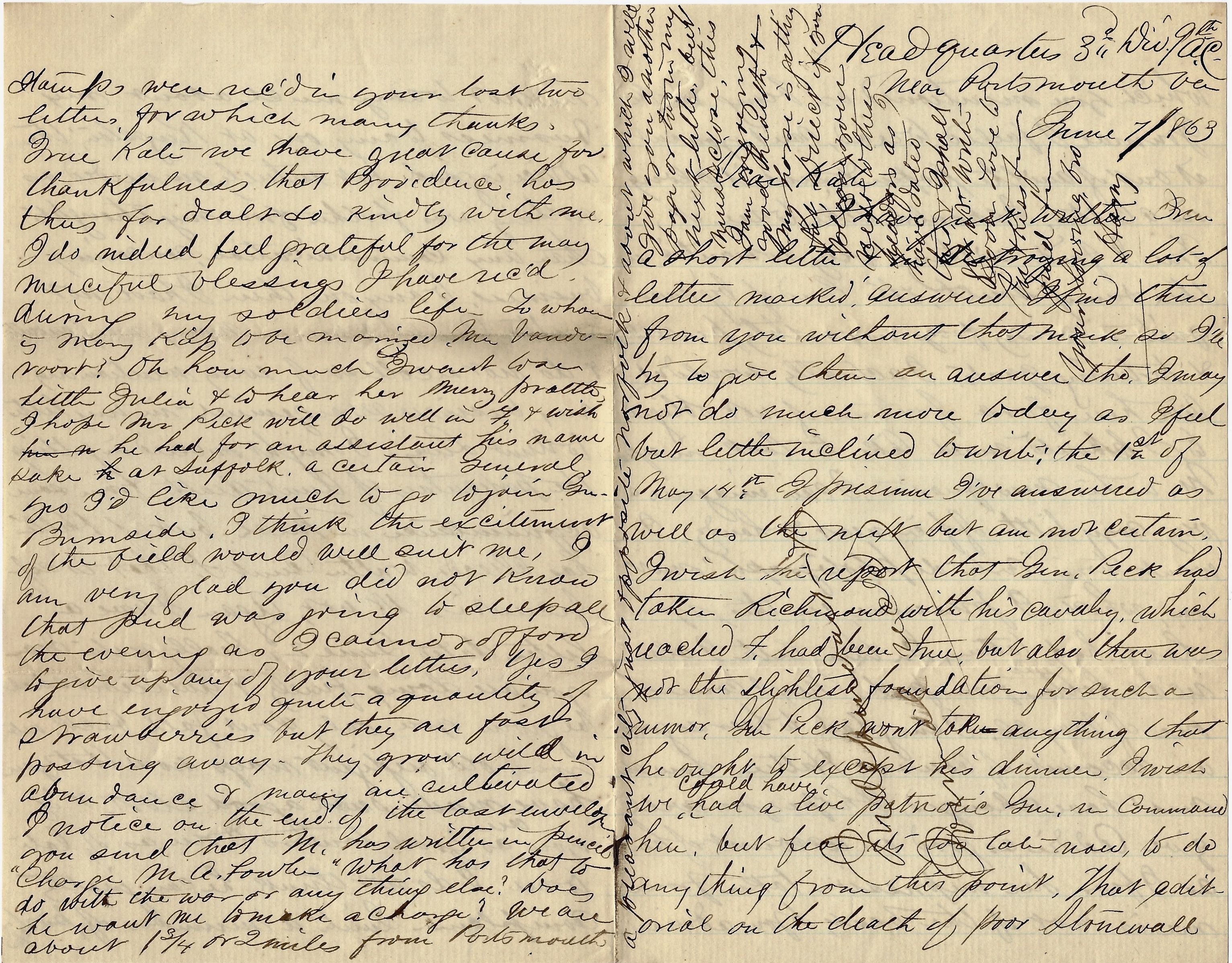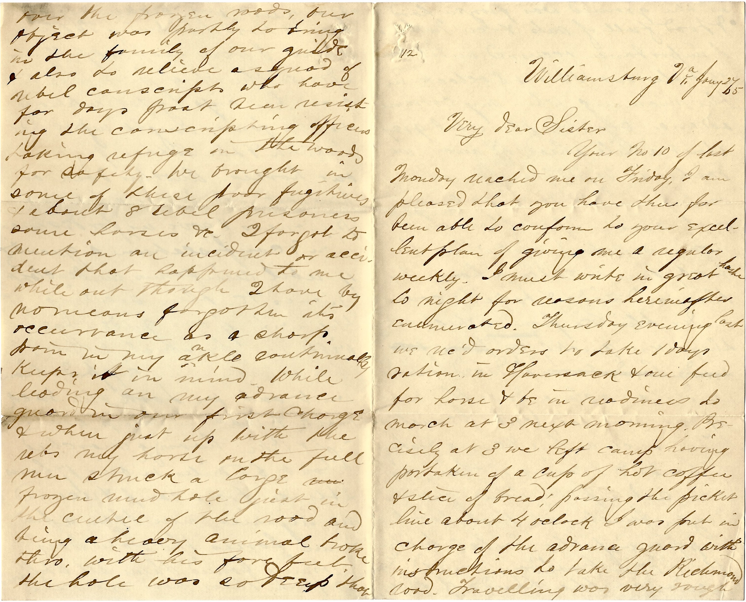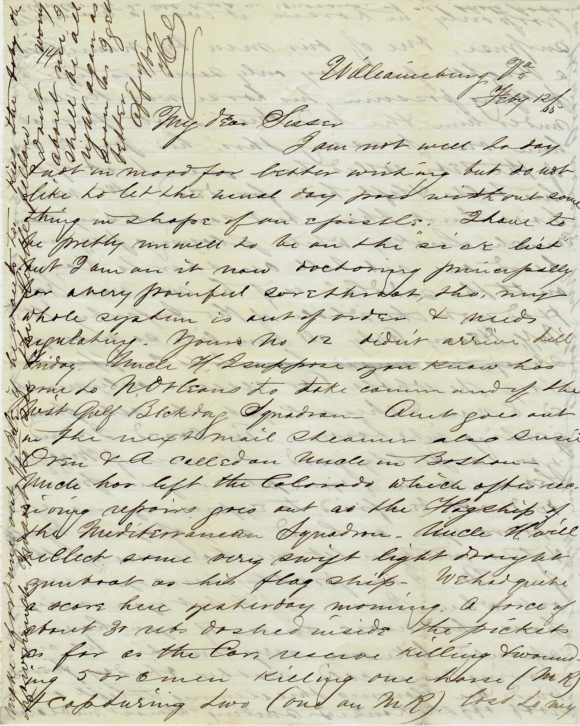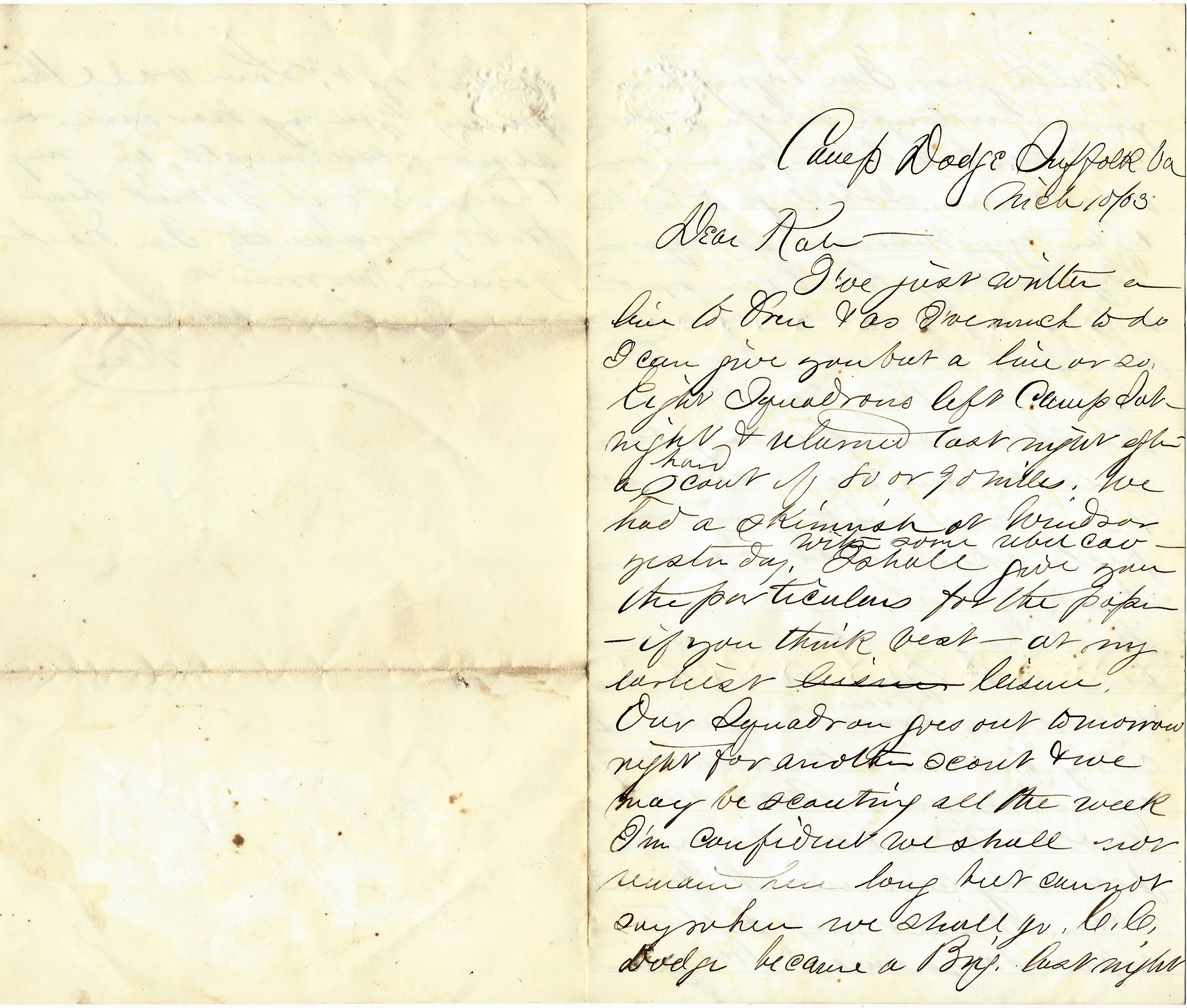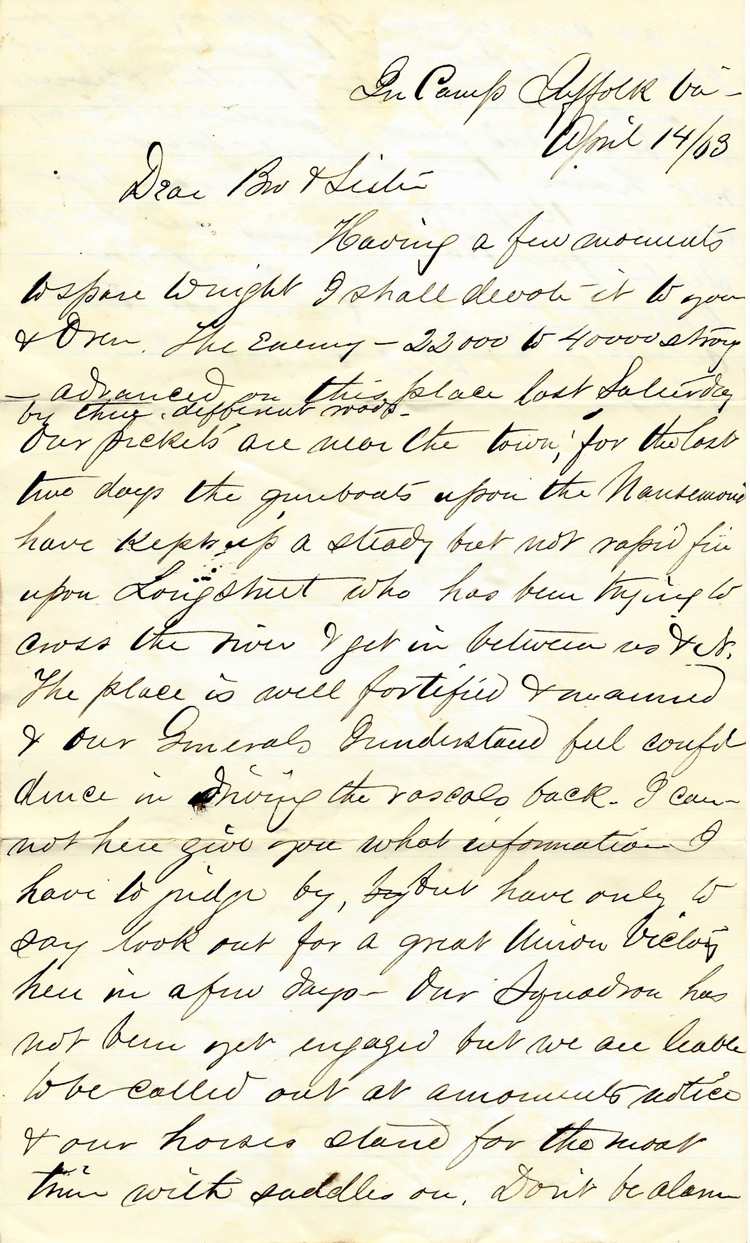 Om Saturday as you may suppose I did considerable sleeping & on Sunday morning I went on picket. Came off yesterday morning and since have not felt much in writing mood. The Rebels are reported marching under Gen. Longstreet to the attack of Suffolk & are said to be as far as Petersburg, 40 miles. There is a rebel regiment posted in the woods in the vicinity of Providence Church and they continue to harass our pickets. We have one Troop there on picket all the time & have had four or five [skirmishes]. Last night Troop M had a skirmish with the rebels there. One corporal shot but not killed. I fear we are to have stirring times here soon. This much I can say, I think this place is well defended & can be held against a very large force.
