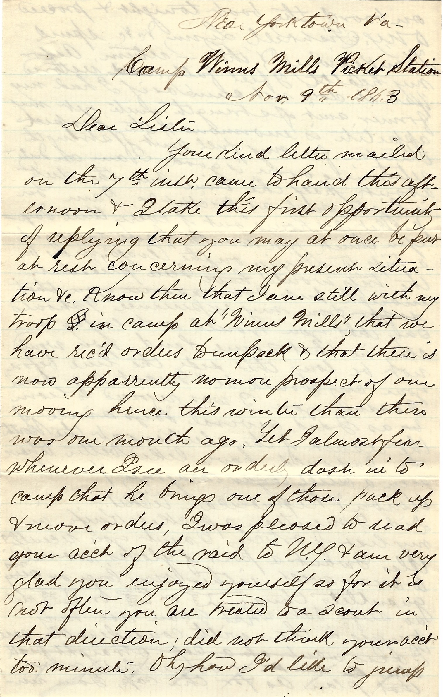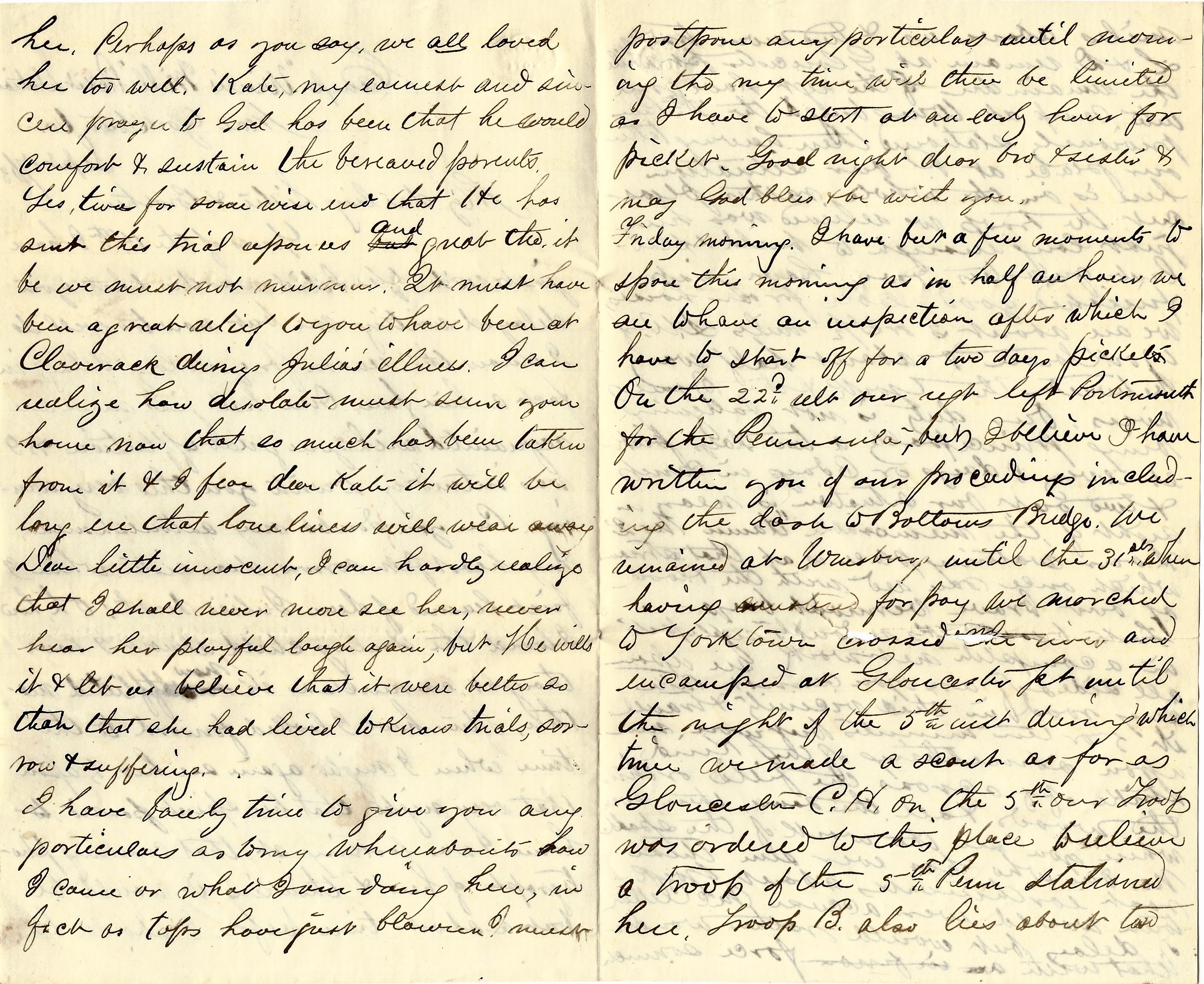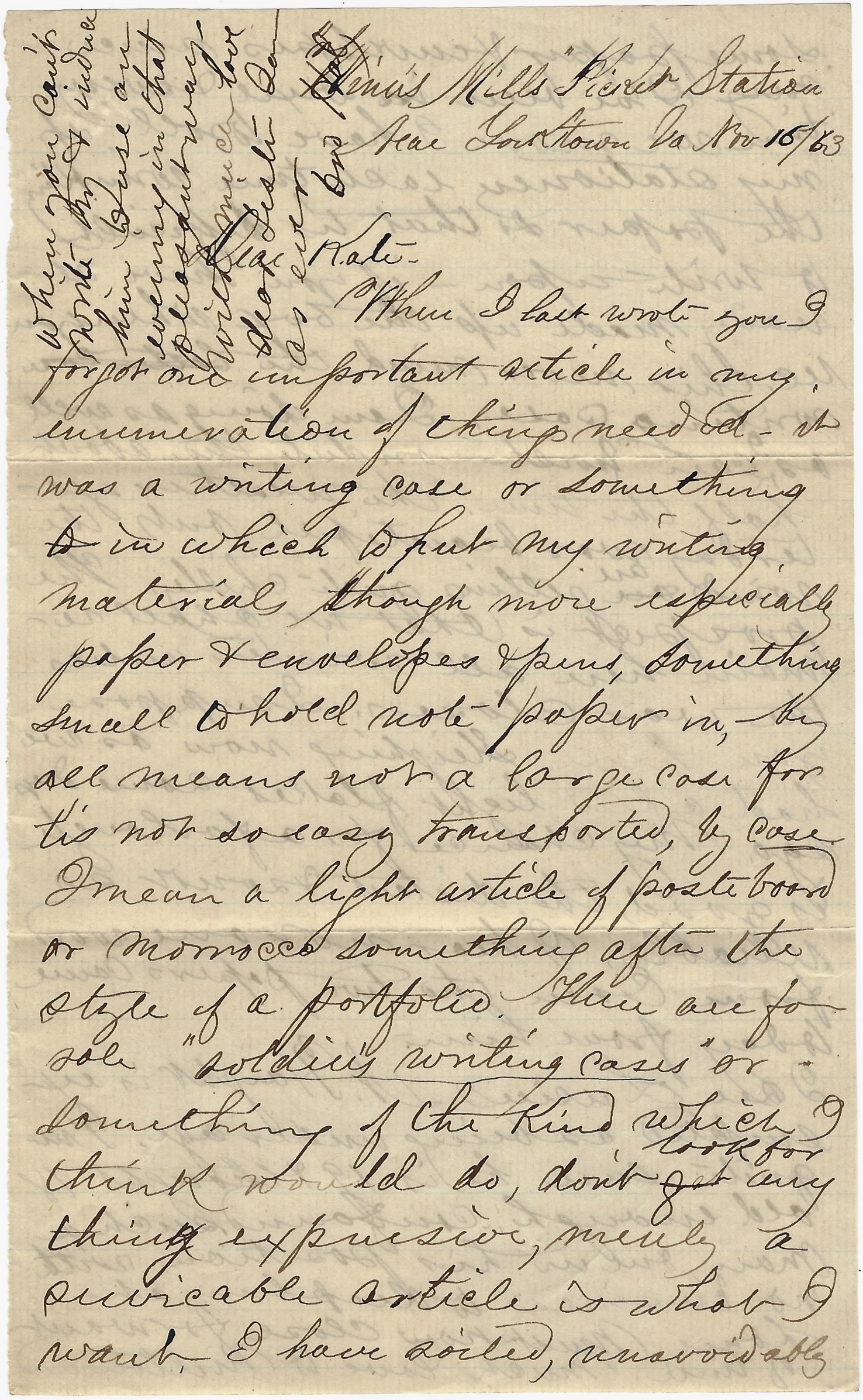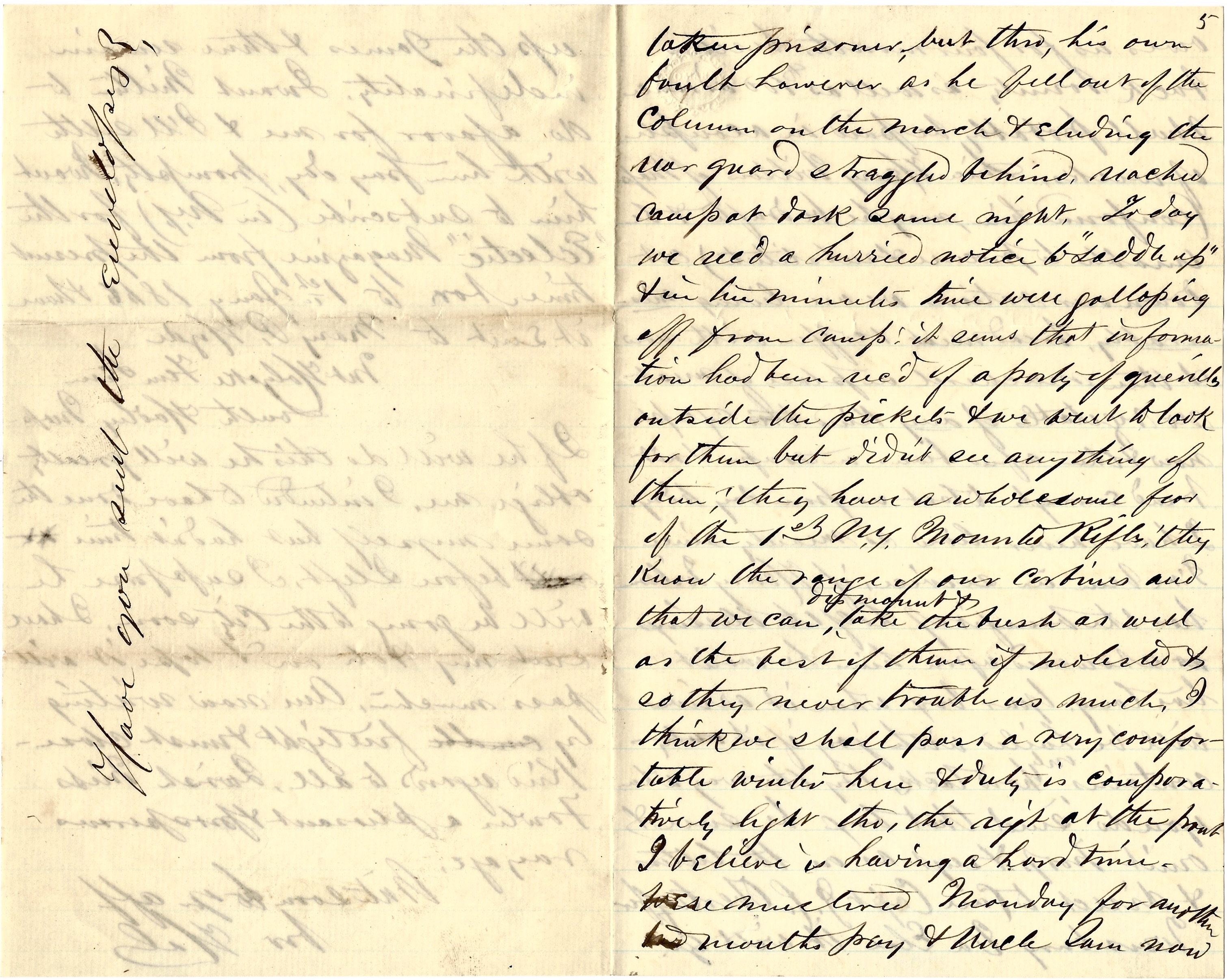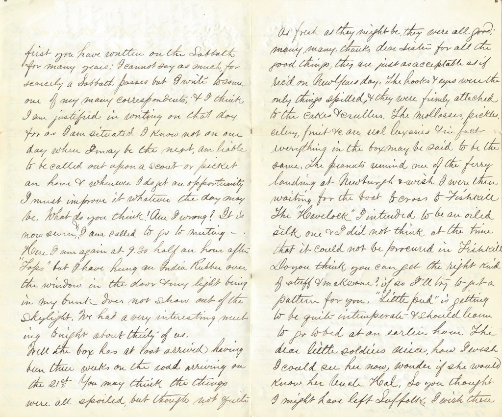 Yours mailed the 23rd inst. was tonight received. I have just returned to camp from a four days picket & consequently did not get the letter as soon as it came for I left word not to have my mail sent out to me. I wrote you a few days since just to let you know that I was well; my wrist was then quite lame but is now well. I do not know how I lamed it unless I caught cold in it sleeping on the cold ground. You propose sending a box & ask what I am in want of. I would like a dog [?] hooks & eyes and if not too much trouble, to get an oiled silk havelock. Another thing I would like & that is some molasses. Can you put some up in a little jug or something tight? I have seen it sent that way quite safely by being packed in the centre of the box.