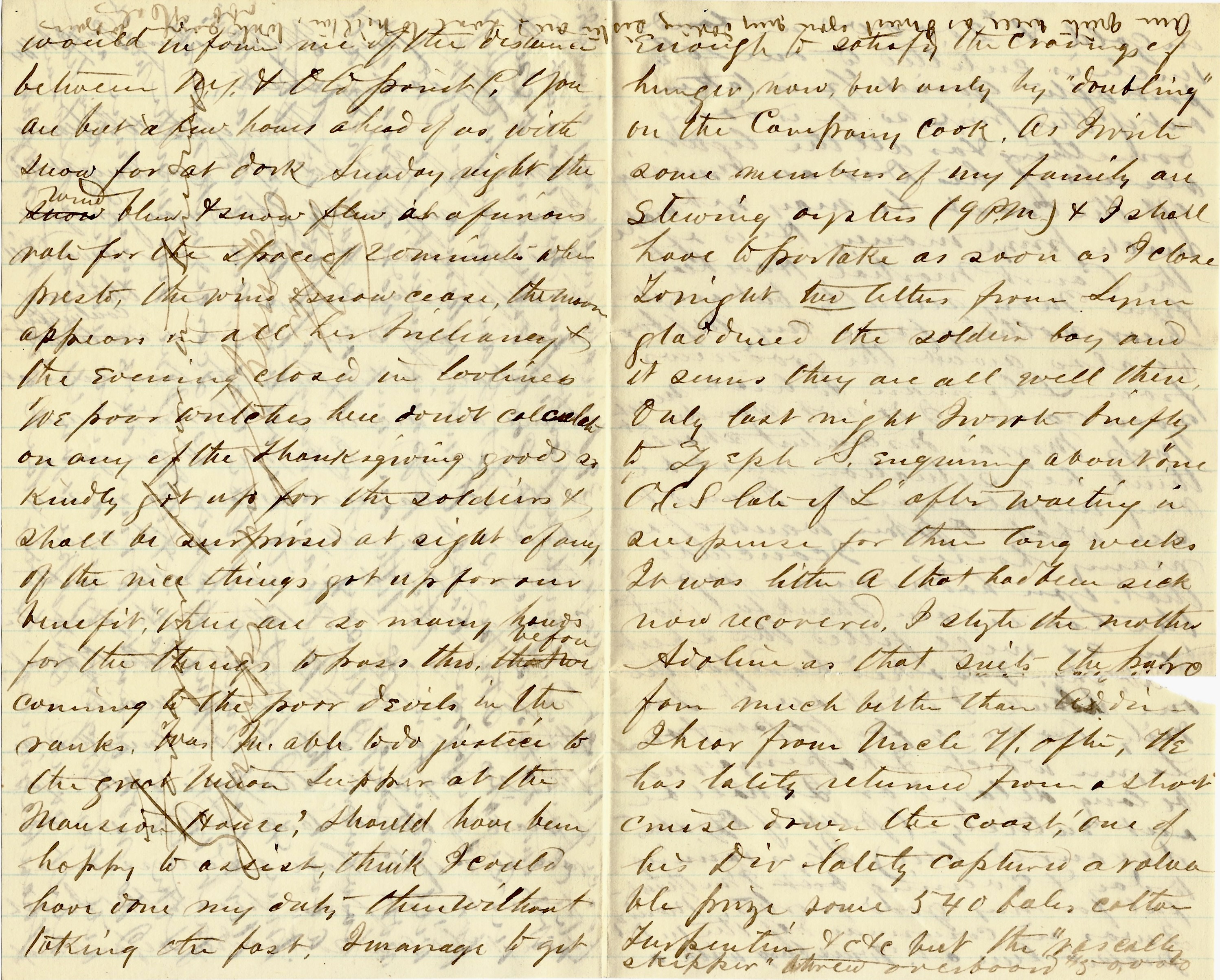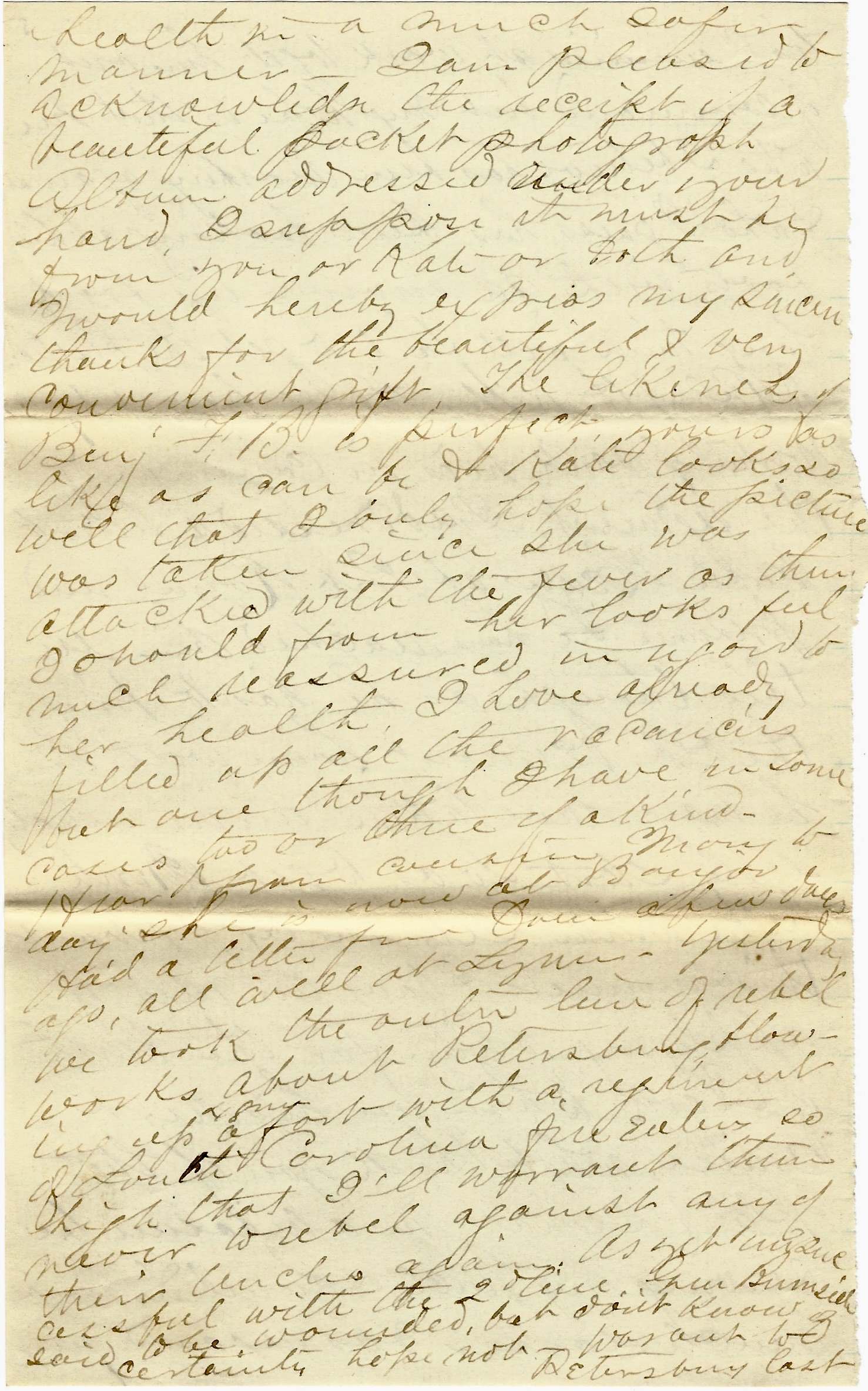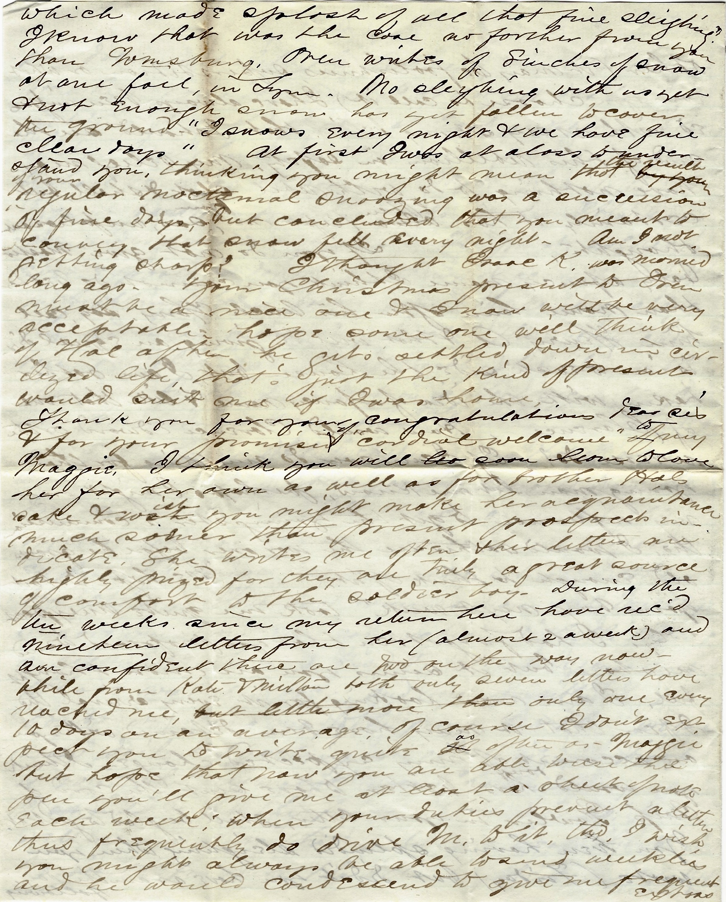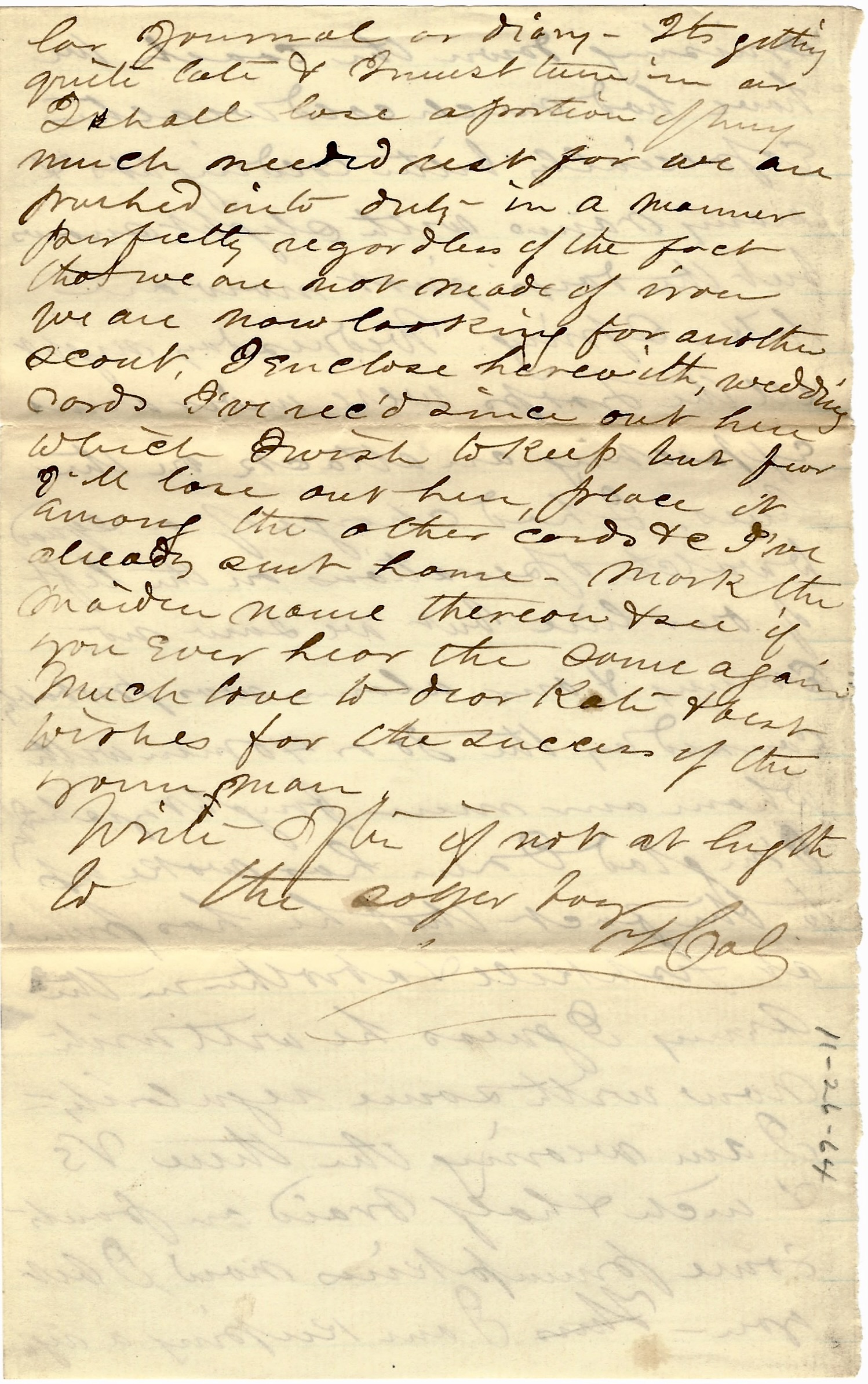Yours mailed the 23rd inst. was tonight received. I have just returned to camp from a four days picket & consequently did not get the letter as soon as it came for I left word not to have my mail sent out to me. I wrote you a few days since just to let you know that I was well; my wrist was then quite lame but is now well. I do not know how I lamed it unless I caught cold in it sleeping on the cold ground. You propose sending a box & ask what I am in want of. I would like a dog [?] hooks & eyes and if not too much trouble, to get an oiled silk havelock. Another thing I would like & that is some molasses. Can you put some up in a little jug or something tight? I have seen it sent that way quite safely by being packed in the centre of the box.
