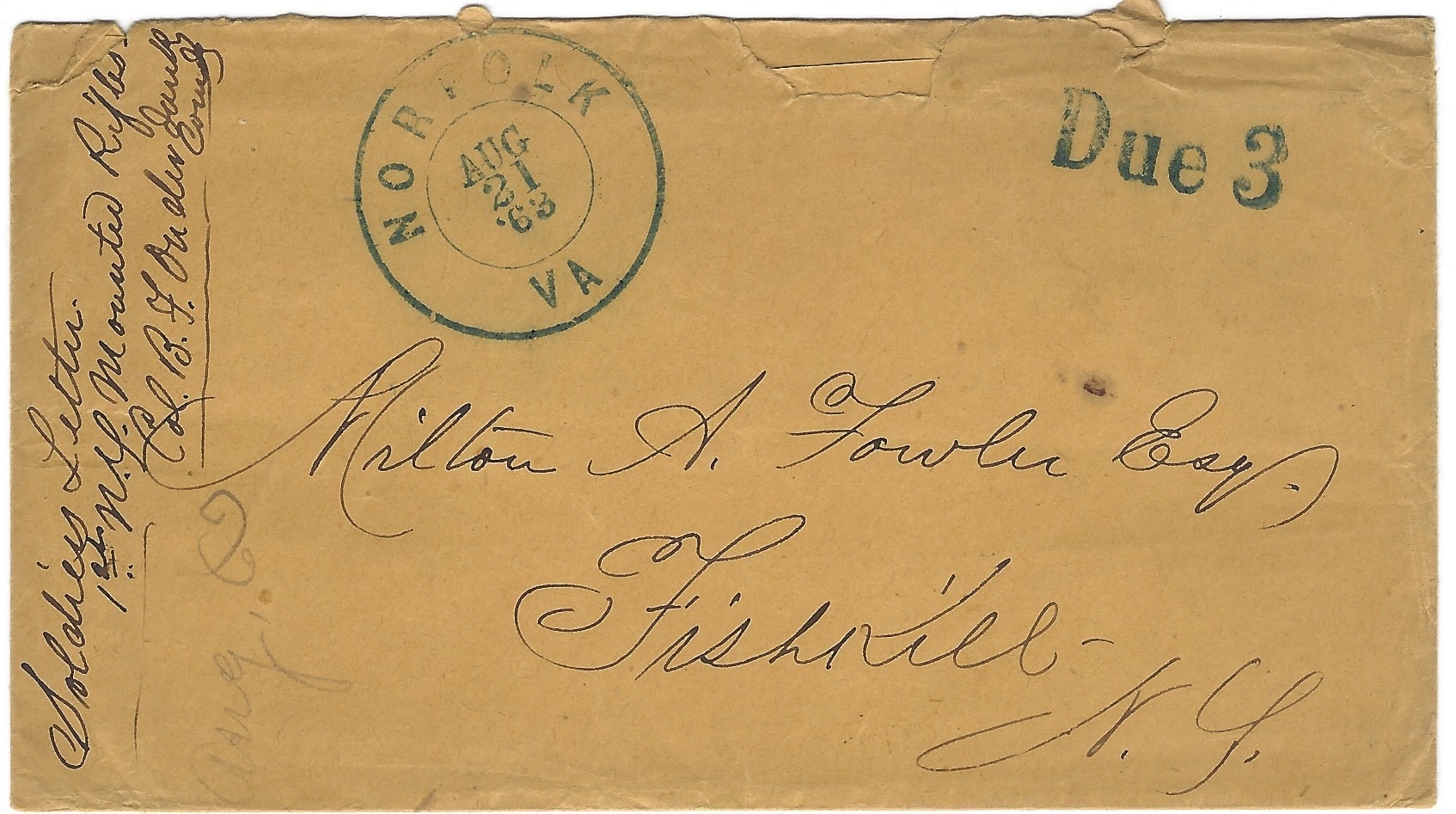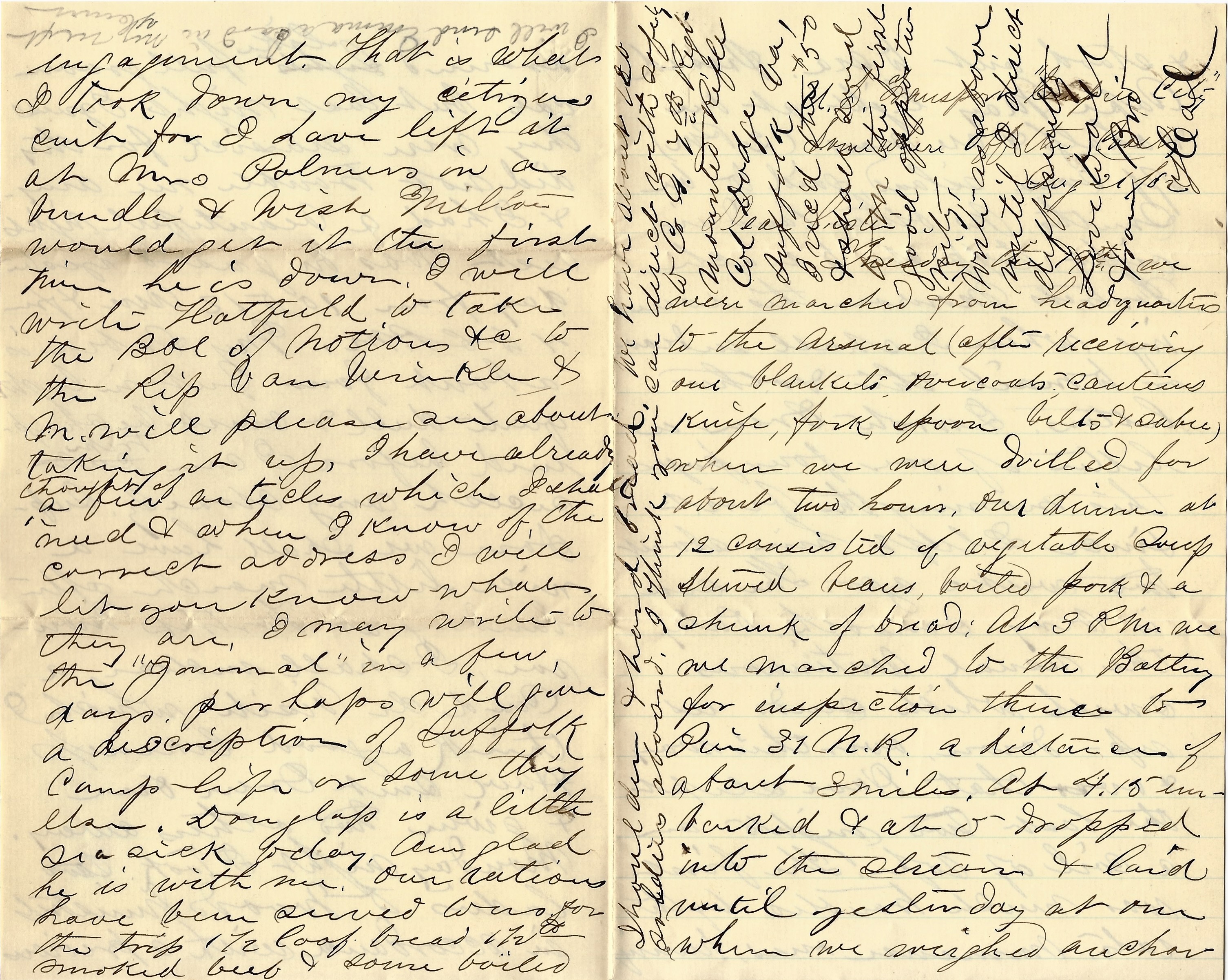 I arrived at Norfolk from Fortress Monroe at 12.30 one week ago last Friday & here, a distance of 2.5 miles at 4 o’clock. When we arrived here, Co. A of the 1st Battalion were away on a scout in North Carolina. They have since returned. Yesterday Co. C started on a scout in the same direction and Co. B on at Norfolk, so that most of those in camp are recruits. 110 arrived yesterday from New York. We have yet no officers here though they have ben commissioned. They probably will not arrive for several days.