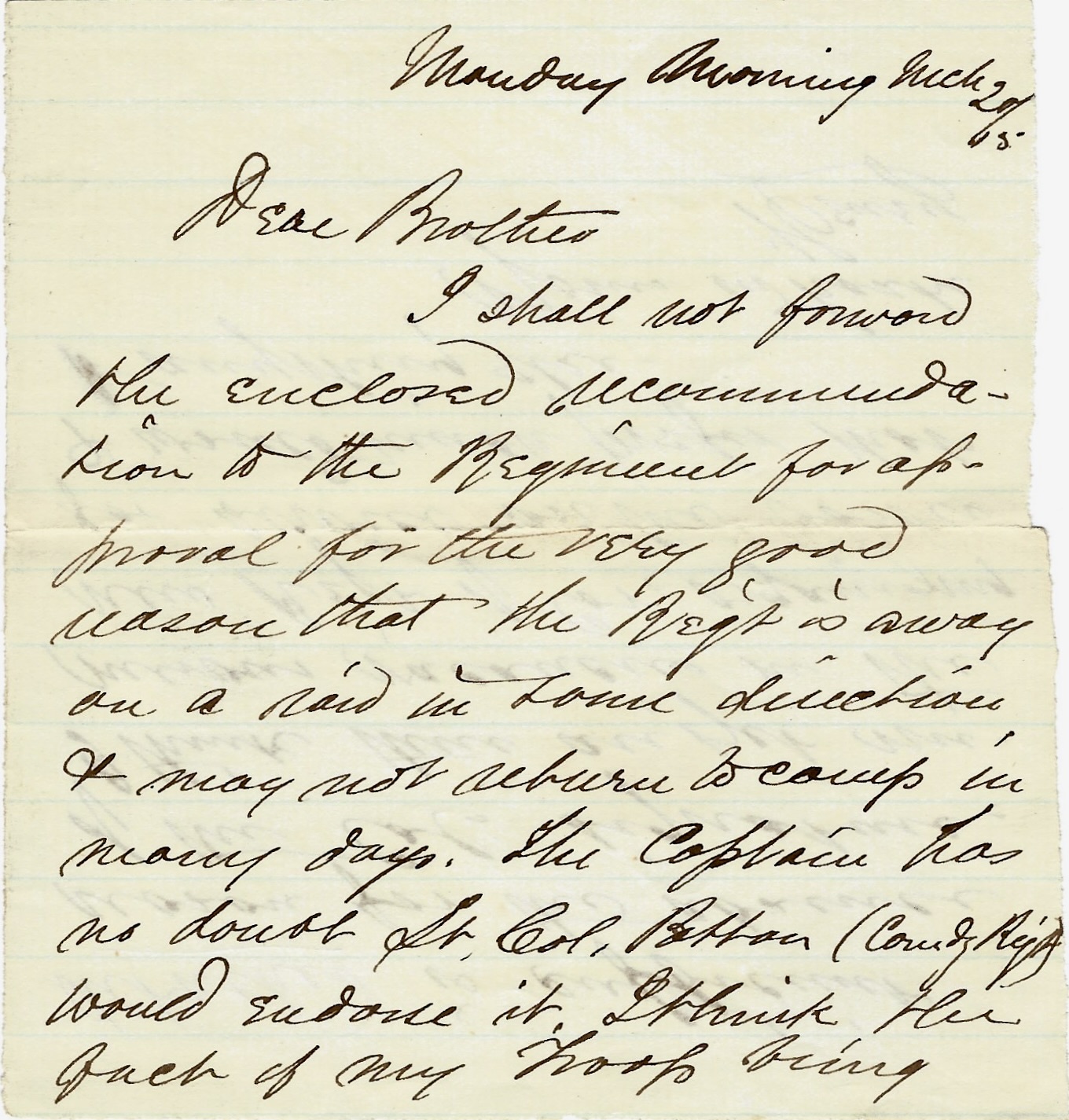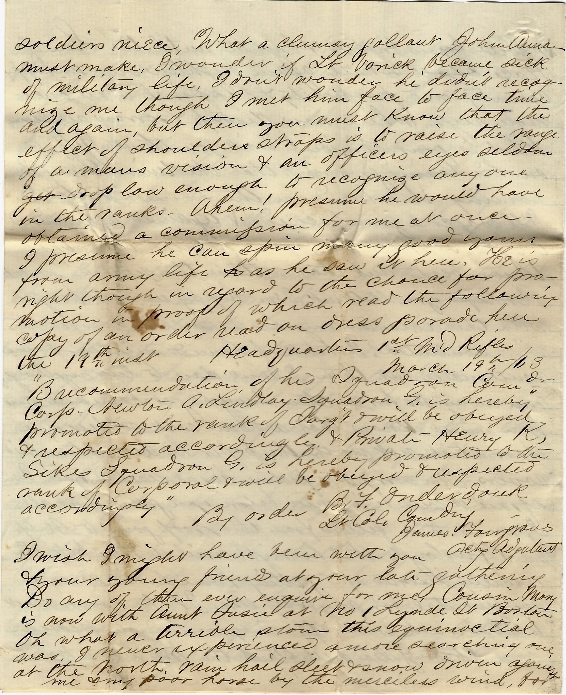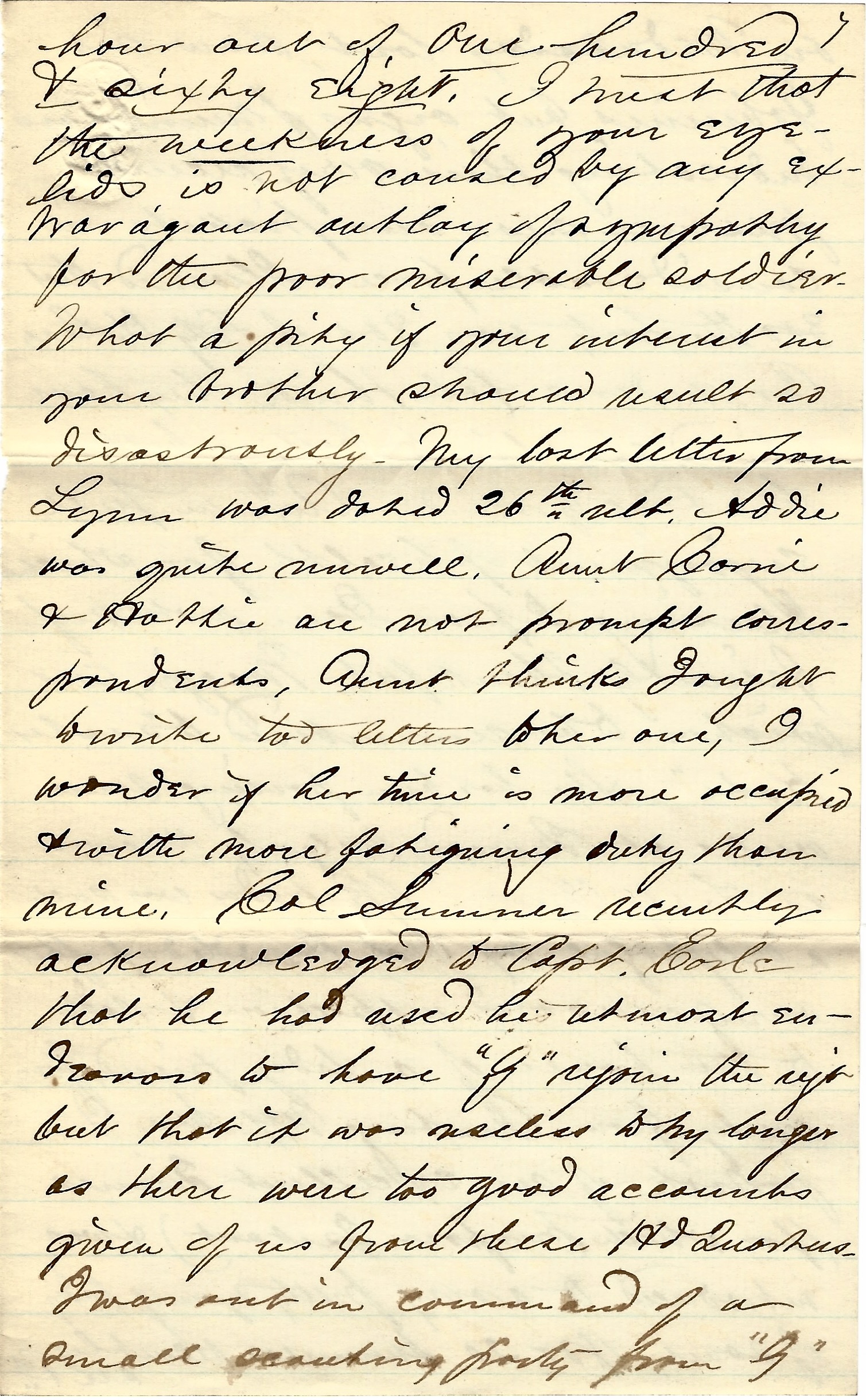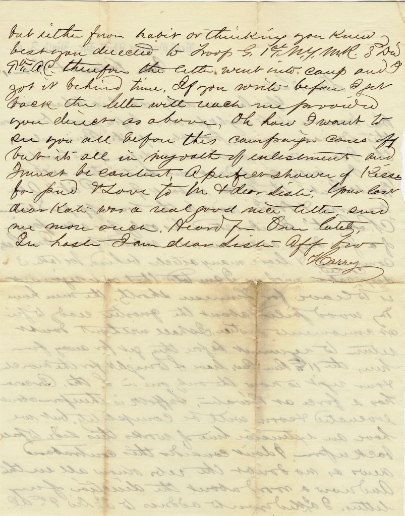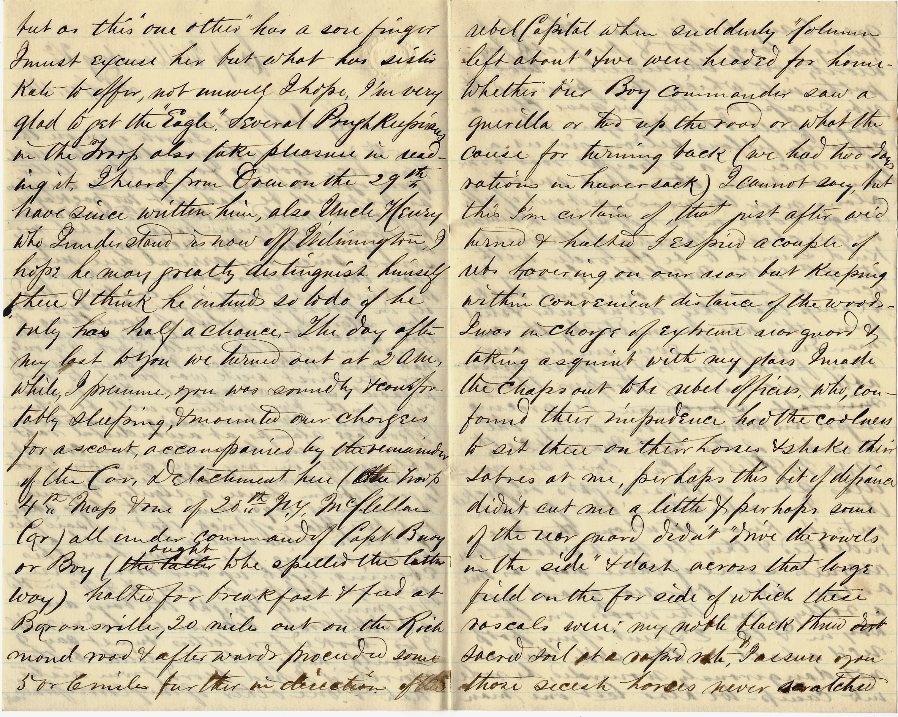 This forenoon the prisoners were sent to Gen. Mansfield’s headquarters. I have my horse now—a jet black, rather small. Drew him today & this morning was on mounted drill for the1st time & was told by the drill master that I drilled better than anyone in the squad. In sabre drill I am some pumpkins & can flourish my sabre in all directions, points, parries, guard, &c. according to the most approved tactics. This was all learnt us on foot. I must close & write again soon for I have much to say that I think will interest you. Write often & do not wait for me to write for my duties are numerous. I believe U sent you my carte-de-visit since I left New York, did I not. Love to all . Your brother, — Henry