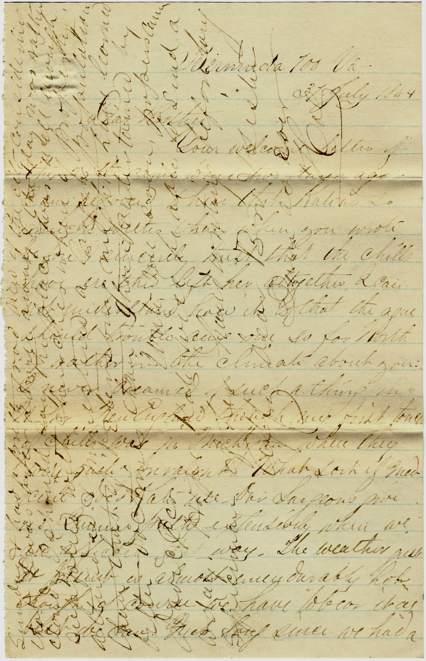 It is with pleasure that I can sit down to write a few lines to let you know that we are all well at home and I hope these few lines will find you the same. I got a letter from you last night and I was glad to hear that you was so well. [It was] the letter that you put the candy in and the children was all so pleased to get it. There was none for the baby [but] they parted it. I was sorry to hear that you was so near the fighting and [though] you told me in your letter that I must not fret so much, but I can’t help it. I fret more now that you have gone where you are but I hope the Lord will speed the time when you can come home again. There was so many that went from here that got killed and wounded and I don’t know when I shall hear the news myself. William Curran was wounded in his hip and had to have his leg cut off.